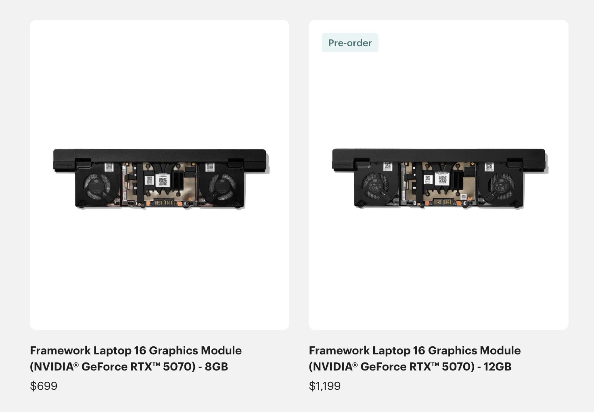 Первые игровые ноутбуки с этой новой версией GeForce RTX 5070 должны начать поставляться в ближайшие недели, но Nvidia еще не объявила официальную цену. Рамка уже открыла предварительные заказы на модуль обновления GeForce RTX 5070 12 ГБ для Framework Laptop 16, который будет поставляться с июня. Цена на удивление высока - GeForce RTX 5070 12 ГБ стоит 1199 долларов, а не 699 долларов, как вариант с 8 ГБ графической памяти. Это означает, что покупатели доплачивают 500 долларов или 71,5% за 4 ГБ или на 50% больше VRAM.