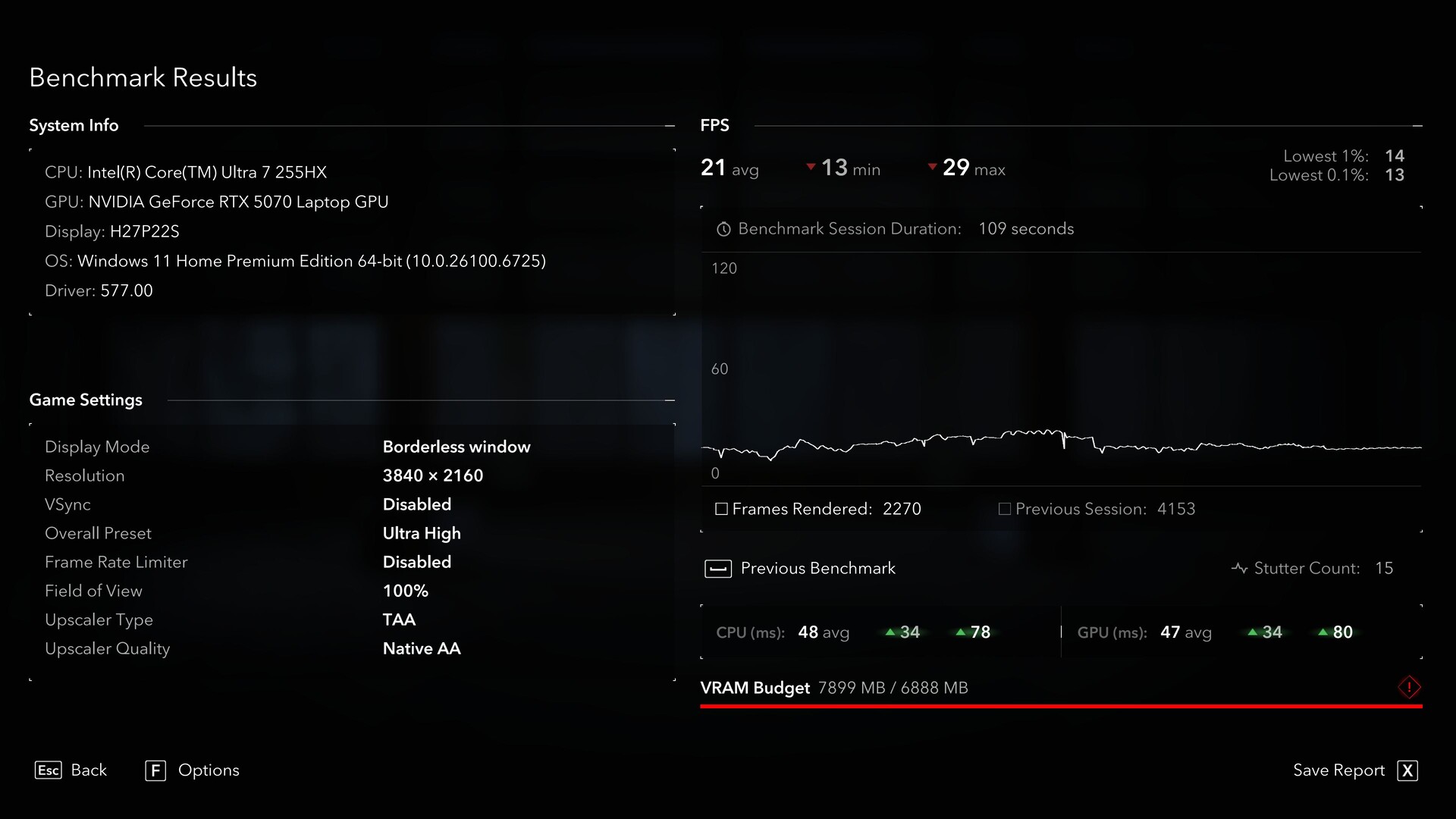 Чтобы еще больше нагрузить VRAM, мы переключились в режим "родного" 4K. Теперь, по крайней мере, согласно индикатору, требования к VRAM превышают предел с изрядным отрывом - и мы зафиксировали 15 заиканий. Проблема здесь в том, что мы уже снизили среднее значение 21 fps в родном 4K, поэтому трудно сказать, действительно ли заикания вызваны ограничениями VRAM или просто общей нагрузкой на GPU.