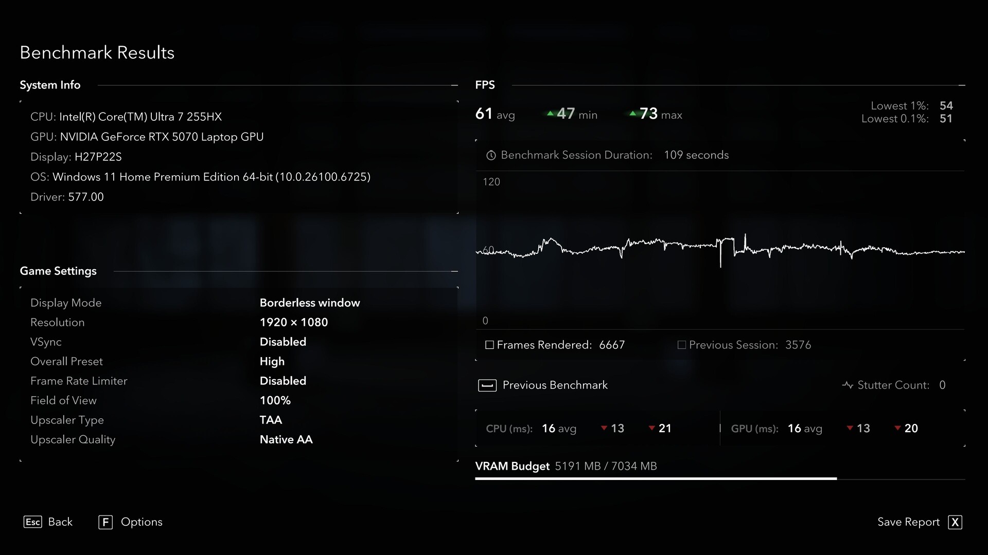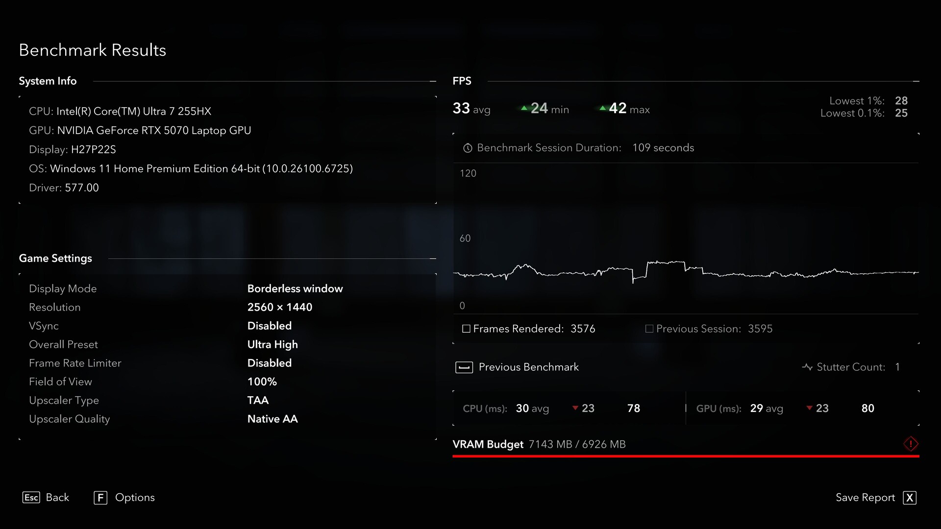 В игре Assassin's Creed Shadows при разрешении 2 560 x 1 440 (QHD) игра сообщает, что бюджет VRAM превышен примерно на 100 МБ. Однако в следующем бенчмарке время смены кадров остается стабильным - даже если средняя частота кадров держится на уровне 38 fps. Внутренний счетчик заиканий регистрируется на уровне 1.