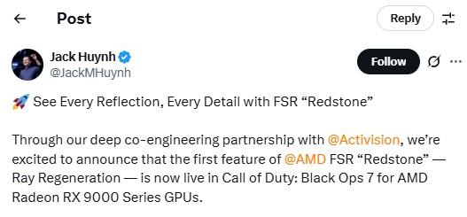 Отдельно руководитель AMD Джек Хуинь (Jack Huynh) написал на сайте X, что функция регенерации лучей FSR 'Redstone' уже работает в Call of Duty: Black Ops 7 для графических процессоров AMD Radeon RX 9000 Series, пообещав, что впереди еще много нового.