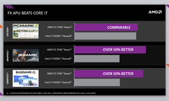 FX-7600P использует четыре вычислительных процессорных ядра с частотой вплоть до 3.6 ГГц, а также восемь графических вычислительных блоков архитектуры Radeon R7. AMD предпочитает считать, что это - единый вычислительный кластер из 12 блоков, но разработчики программного обеспечения пока не слишком торопятся оценить преимущества гетерогенной архитектуры AMD, так что и обращать особого внимания на маркетологические фразы также не стоит.