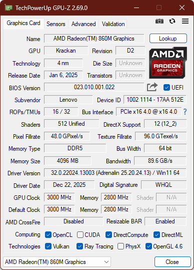 Покупая Lenovo ThinkPad T14 Gen 6 AMD, Вы получаете возможность выбора между AMD Ryzen AI 5 Pro 340 и Ryzen AI 7 Pro 350а также соответствующими AMD Radeon 840M и Radeon 860M GPU. Lenovo устанавливает два слота SO-DIMM с возможностью установки до 64 ГБ оперативной памяти DDR5-5600. Объем памяти, предлагаемый Lenovo, составляет до 2 ТБ в виде одного твердотельного накопителя M.2 2280 NVMe PCIe 4.0.