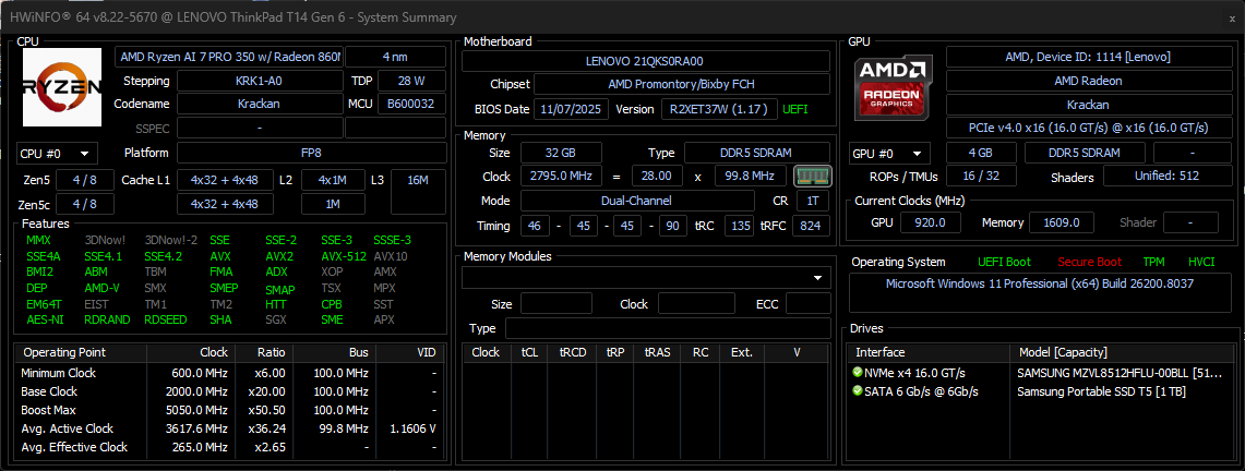 | Lenovo ThinkPad T14 Gen 6 AMD AMD Ryzen AI 7 PRO 350 ⎘ AMD Radeon 860M ⎘ 32 Гбайт ОЗУ, 512 Гбайт SSD | Amazon: Прейскурантная цена: 1800 Euro | 1.4 килог. | 22.1 мм | 14.00" 1920x1200 162 PPI | |