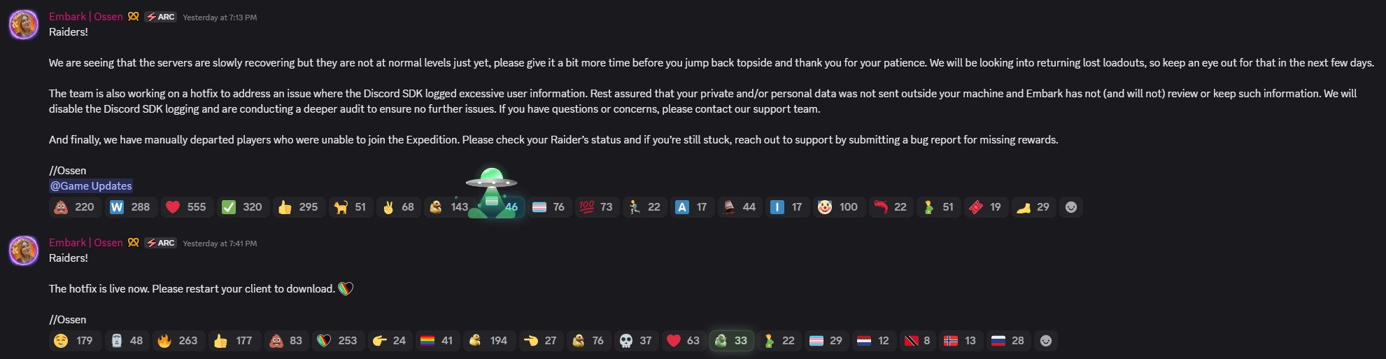Вскоре после того, как проблема стала достоянием общественности, Embark Studios ответила и подтвердила, что Discord SDK записывал больше информации о пользователях, чем предполагалось. Студия заверила игроков, что эти данные никогда не передавались за пределы компьютера пользователя и что разработчики не получали доступа к сообщениям и не хранили их сами. Также было выпущено исправление, которое отключает проблематичное ведение логов. Команда также заявила, что проводит более глубокий аудит, чтобы убедиться, что подобные проблемы не появятся в будущем.