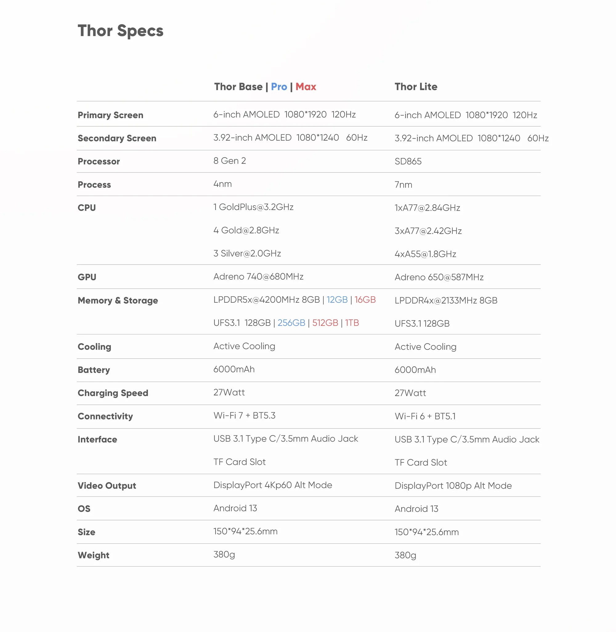 Изменение типа хранилища влияет на Snapdragon 8 Gen 2-версии Thor. К ним относятся Thor Base с 8 Гб ОЗУ и 128 Гб памяти, Thor Pro с 12 Гб ОЗУ и 256 Гб памяти, а также Thor Max с 16 Гб ОЗУ и 512 Гб памяти. Модель Thor Lite, оснащенная Процессором Snapdragon 865 уже использует хранилище UFS 3.1 и будет продолжать это делать.