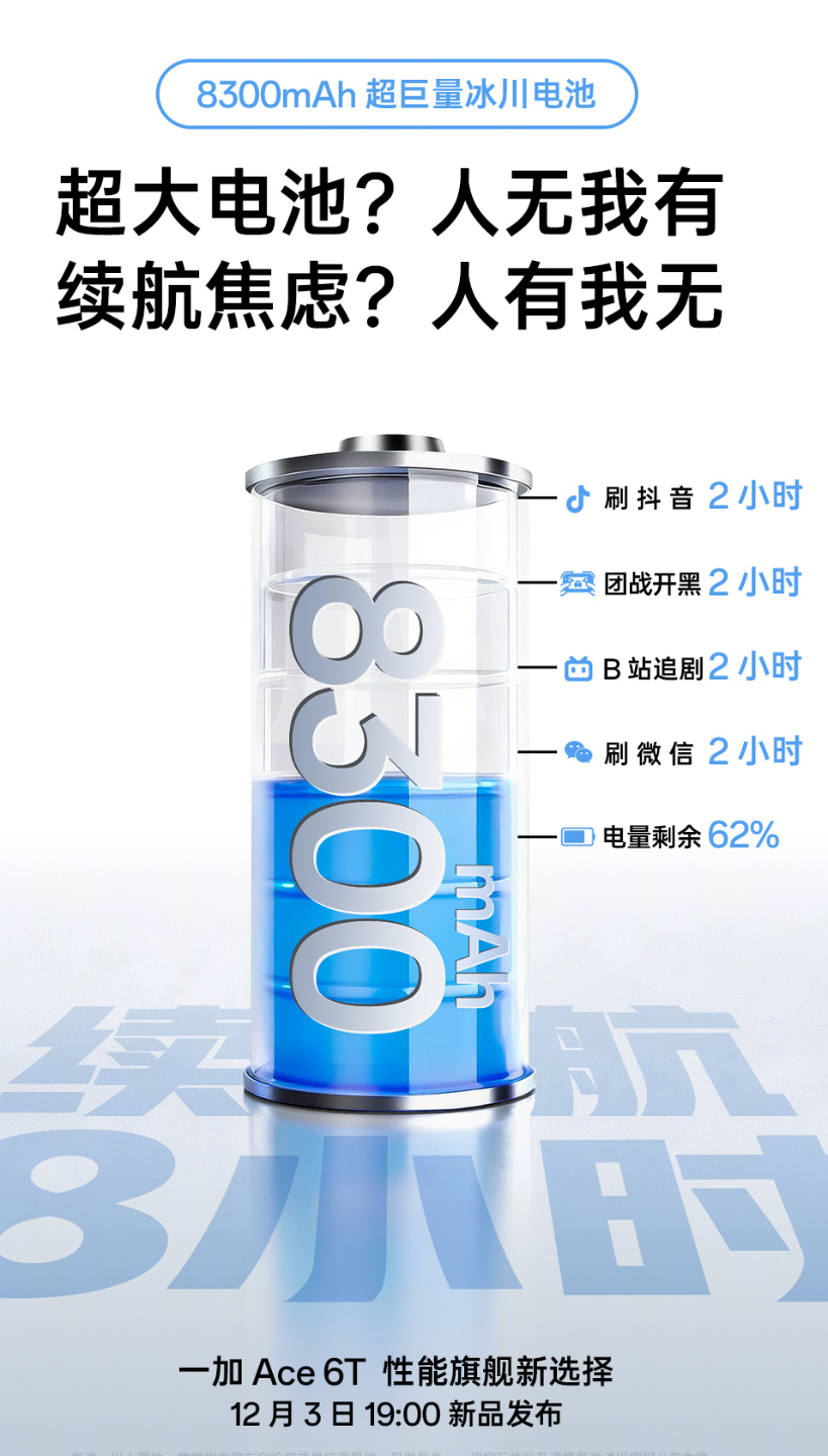 Теперь компания подтвердила, что Ace 6T будет оснащен самым большим аккумулятором среди всех выпущенных ею до сих пор смартфонов. Напомним, что модель Ace 6 претендовал на эту корону в прошлом месяце с емкостью 7 800 мАч, что на 500 мАч больше, чем у OnePlus 15. В новой серии тизеров OnePlus показала, что Ace 6T будет иметь такое же преимущество над Ace 6 благодаря аккумулятору емкостью 8 300 мАч, поддерживающему проводную зарядку 100 Вт.