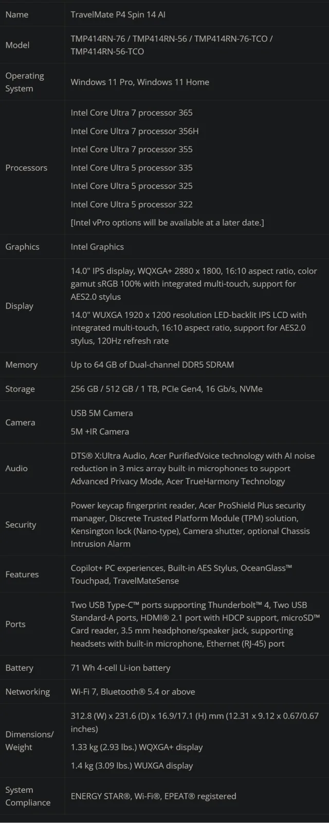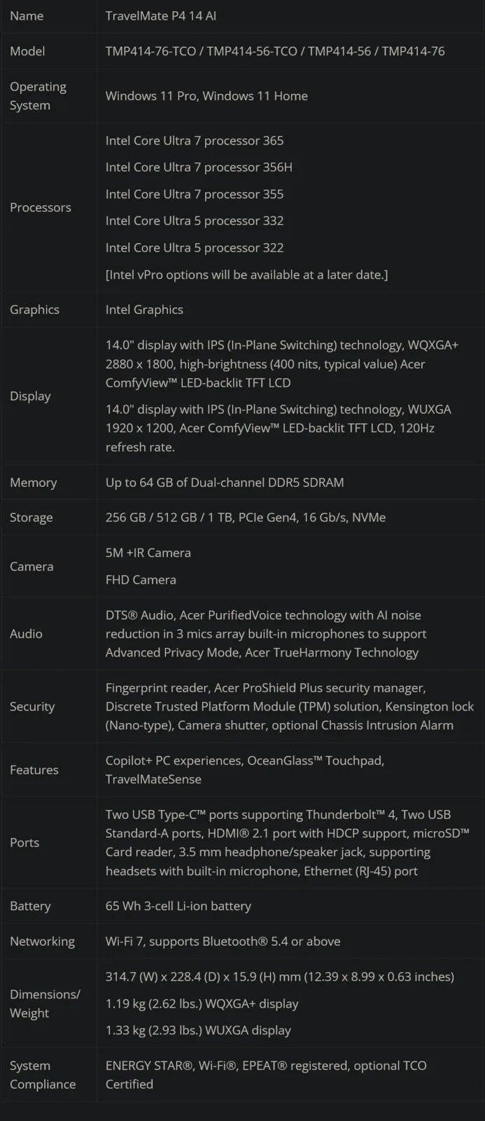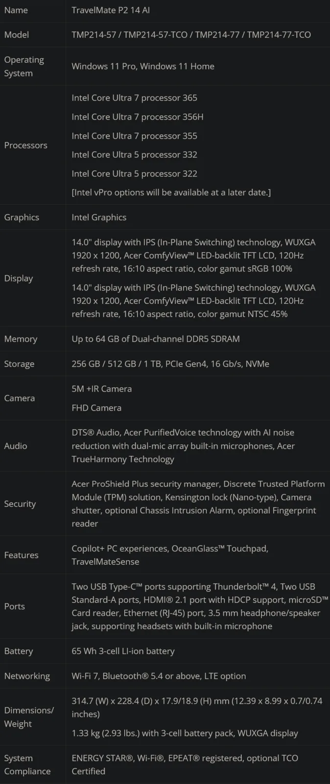Что касается выбора процессора, то все модели, кроме кабриолета, могут быть оснащены процессором Intel Core Ultra 7 365 / 356H / 355 или Core Ultra 5 332 / 322 процессор. TravelMate P4 Spin 14 AI также может быть оснащен Intel Core Ultra 5 335 / 325но отказывается от опции процессора Intel Core Ultra 5 332. Объем оперативной памяти увеличивается до 64 ГБ DDR5, а варианты хранения данных включают 256 ГБ, 512 ГБ и 1 ТБ PCIe 4.0 NVMe SSD для всех моделей