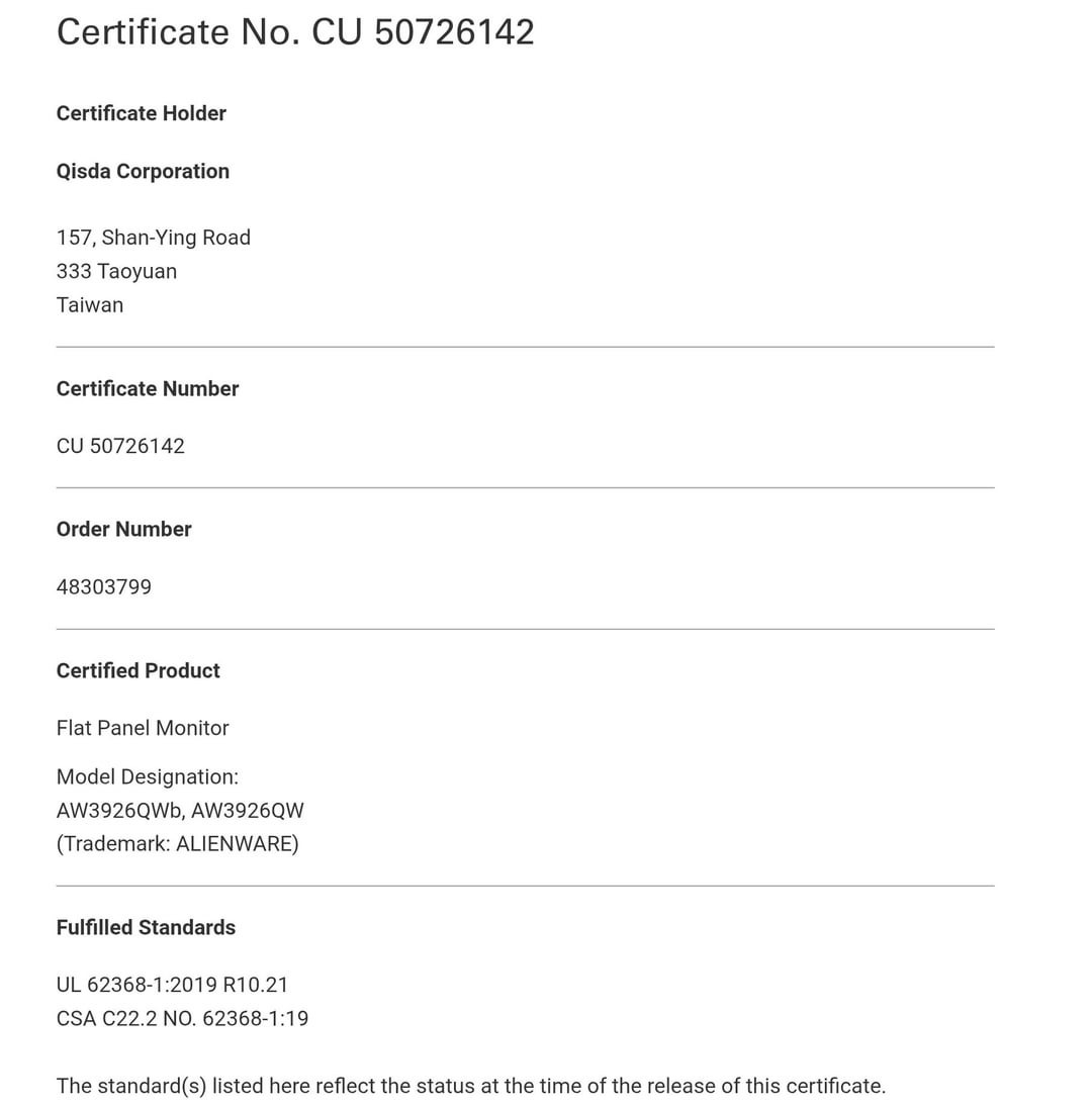 В частности, недавняя сертификация TÜV Rheinland показала, что компания Dell разработала новый монитор Alienware с модельным номером AW3926QW. Исходя из схемы наименований Alienware, AW3926QW - это 39-дюймовый монитор. В этом смысле AW3926QW будет значительно больше, чем AW3425DWкоторый компания Dell представила на мировом рынке чуть более года назад.