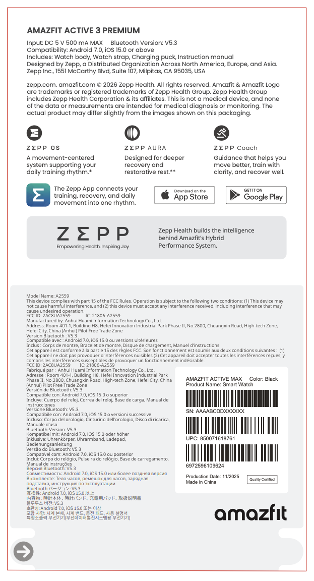 Теперь смарт-часы Amazfit Active 3 Premium снова появились, на этот раз в заявке на Федеральной комиссии по связи (FCC) в США. В документах они упоминаются как модель A2559, а на представлен эскиз упаковки изделия (скриншот ниже) подтверждает название "Amazfit Active 3 Premium".