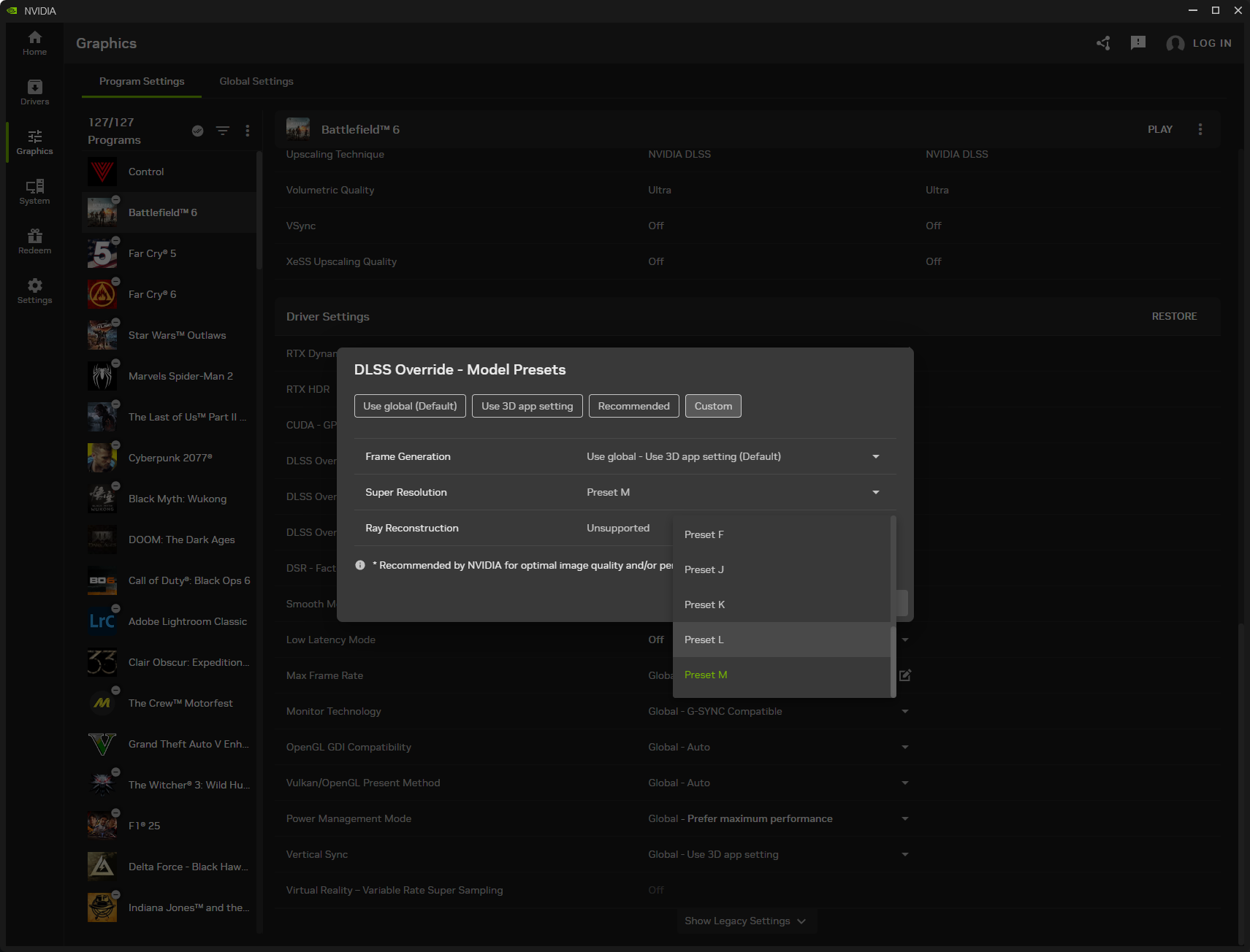 Nvidia использует предустановки, чтобы установить правильную версию DLSS для игры в зависимости от разрешения рендеринга, причем Preset L и Preset M - это новые предустановки для DLSS 4.5.