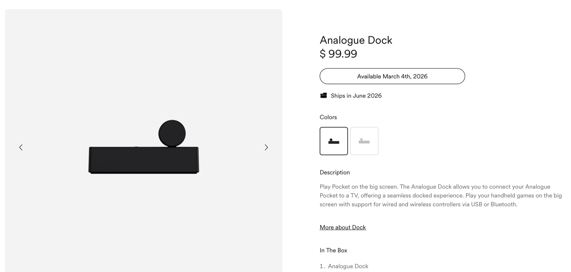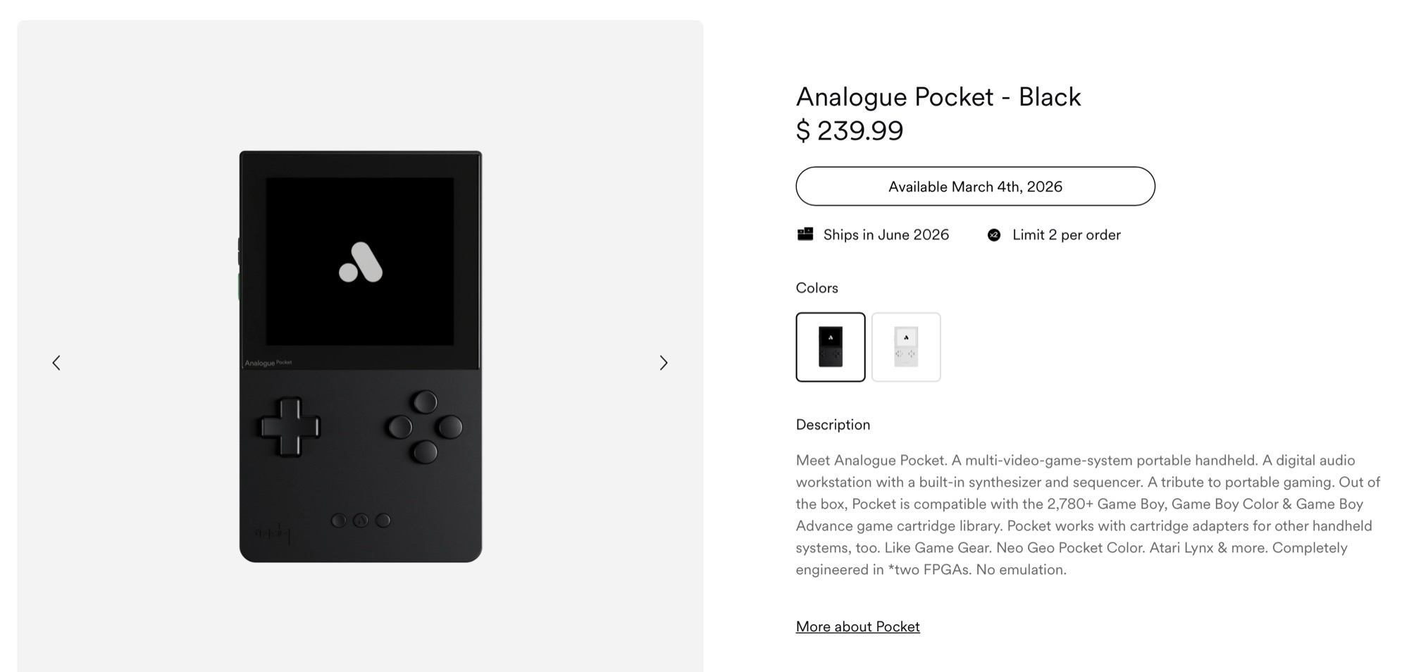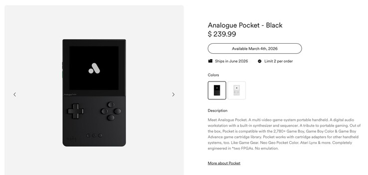 После распродажи в течение последних нескольких недель игровая портативная консоль снова будет доступна для заказа в интернет-магазине производителя https://store.analogue.co/products/analogue-pocket-black начиная со среды, 4 марта, но уже по цене $239. Сопутствующая док-станция также будет доступна для заказа в это же время по цене $99,99. Ожидается, что оба продукта будут поставляться с июня 2026 года. Как заявила компания Analogue на сайте X, это последнее повышение цен связано с тарифами США, которые в настоящее время установлены на уровне 10% на импорт со всего мира
