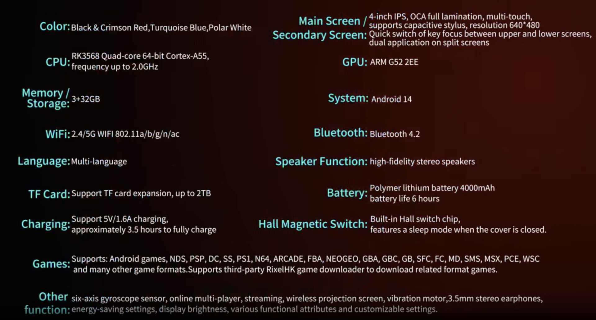 Однако теперь неавторизованное объявление на AliExpress https://www.aliexpress.com/item/1005006262113432.html похоже, ответил на многие оставшиеся вопросы о RG DS раньше времени. Короче говоря, RG DS, похоже, гораздо слабее, чем предполагалось в видеороликах Anbernic. В частности, в листинге указано, что Anbernic оснастила RG DS чипсетом Rockchip RK3568, 3 Гб оперативной памяти, 32 Гб памяти для хранения данных и аккумулятором емкостью 4 000 мАч. Более того, утверждается, что карманный компьютер оснащен дисплеем с разрешением 640 x 480 пикселей, возможно, от модели RG40XX H.