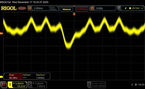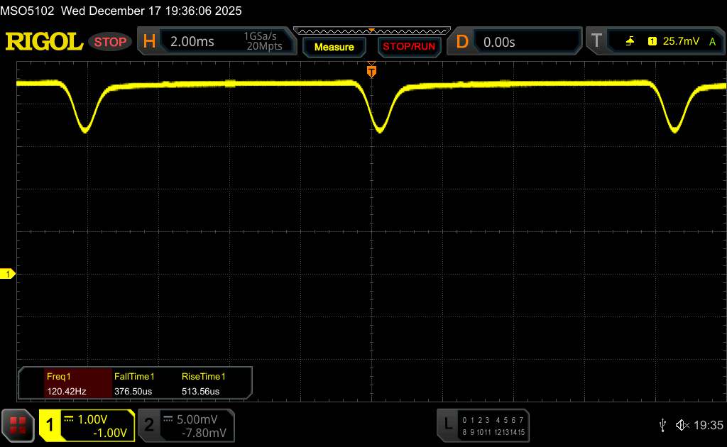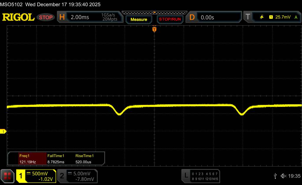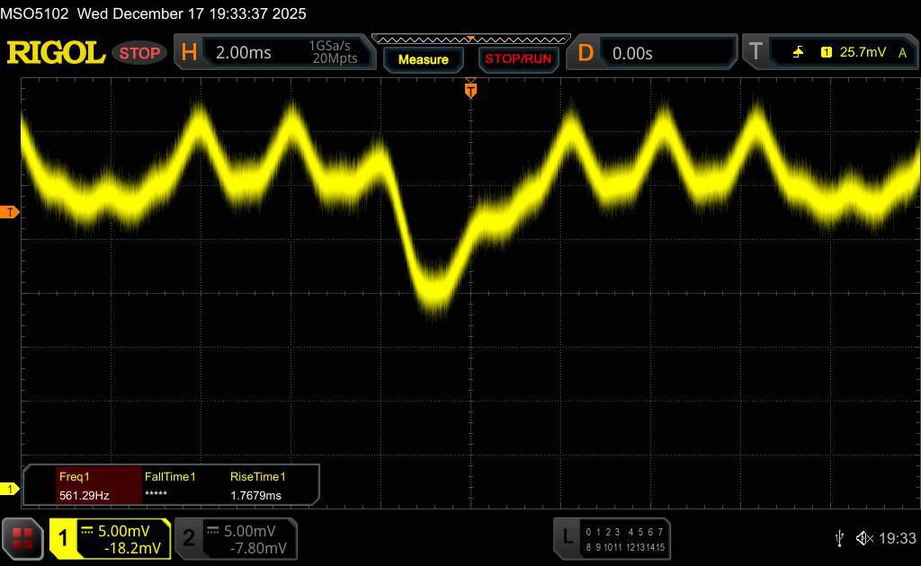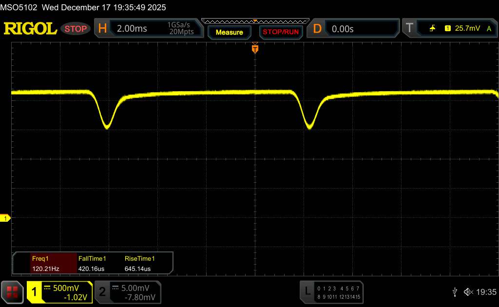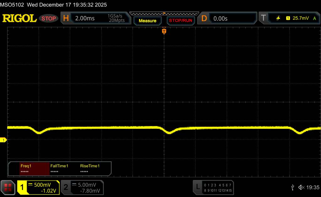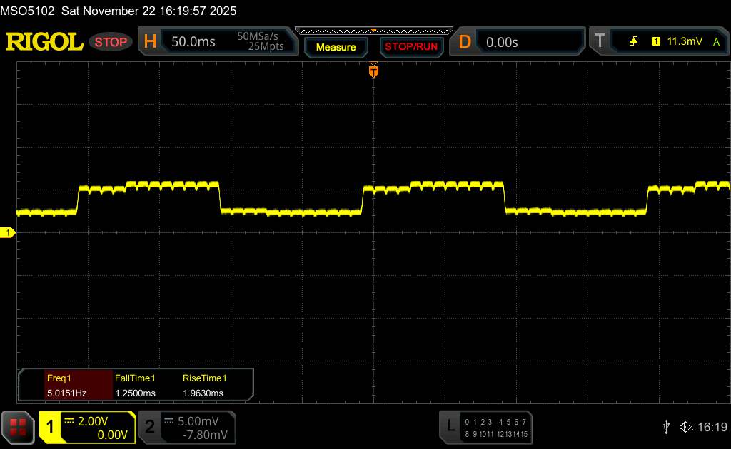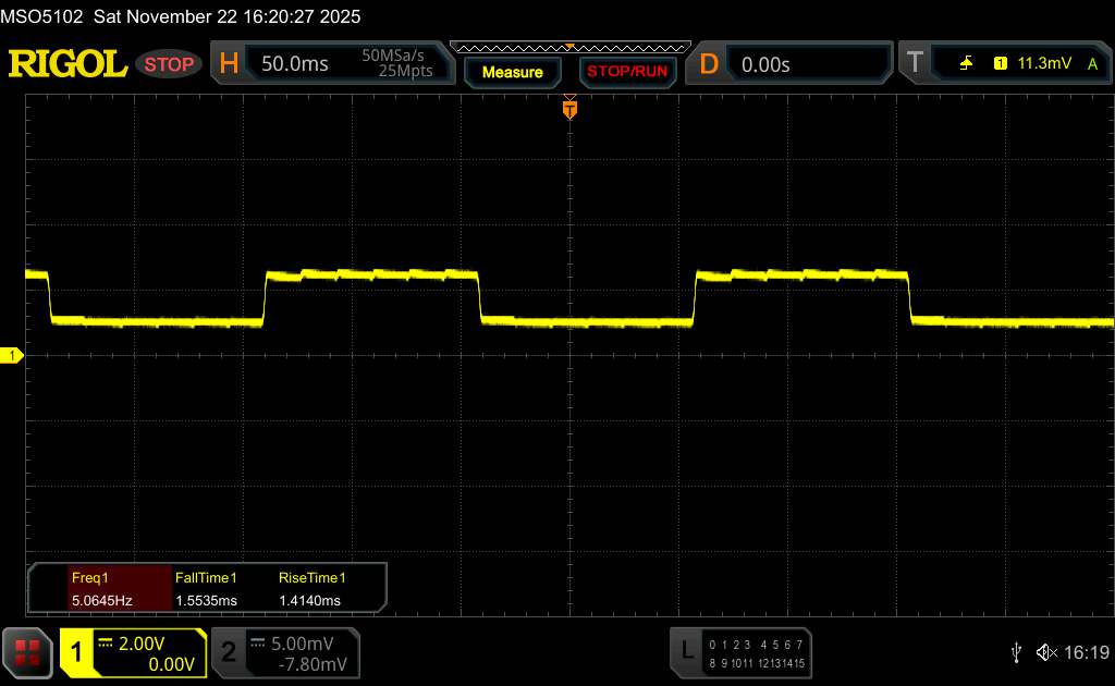Поскольку это OLED-панель, яркость регулируется с помощью широтно-импульсной модуляции. По словам производителя, в iQOO 15 используется высокочастотная ШИМ-модуляция яркости с частотой 2 160 Гц, чтобы уменьшить потенциальные негативные эффекты, такие как видимое мерцание. Наши измерения с помощью программного обеспечения Rigol показали, что базовая частота составляет около 560 Гц.