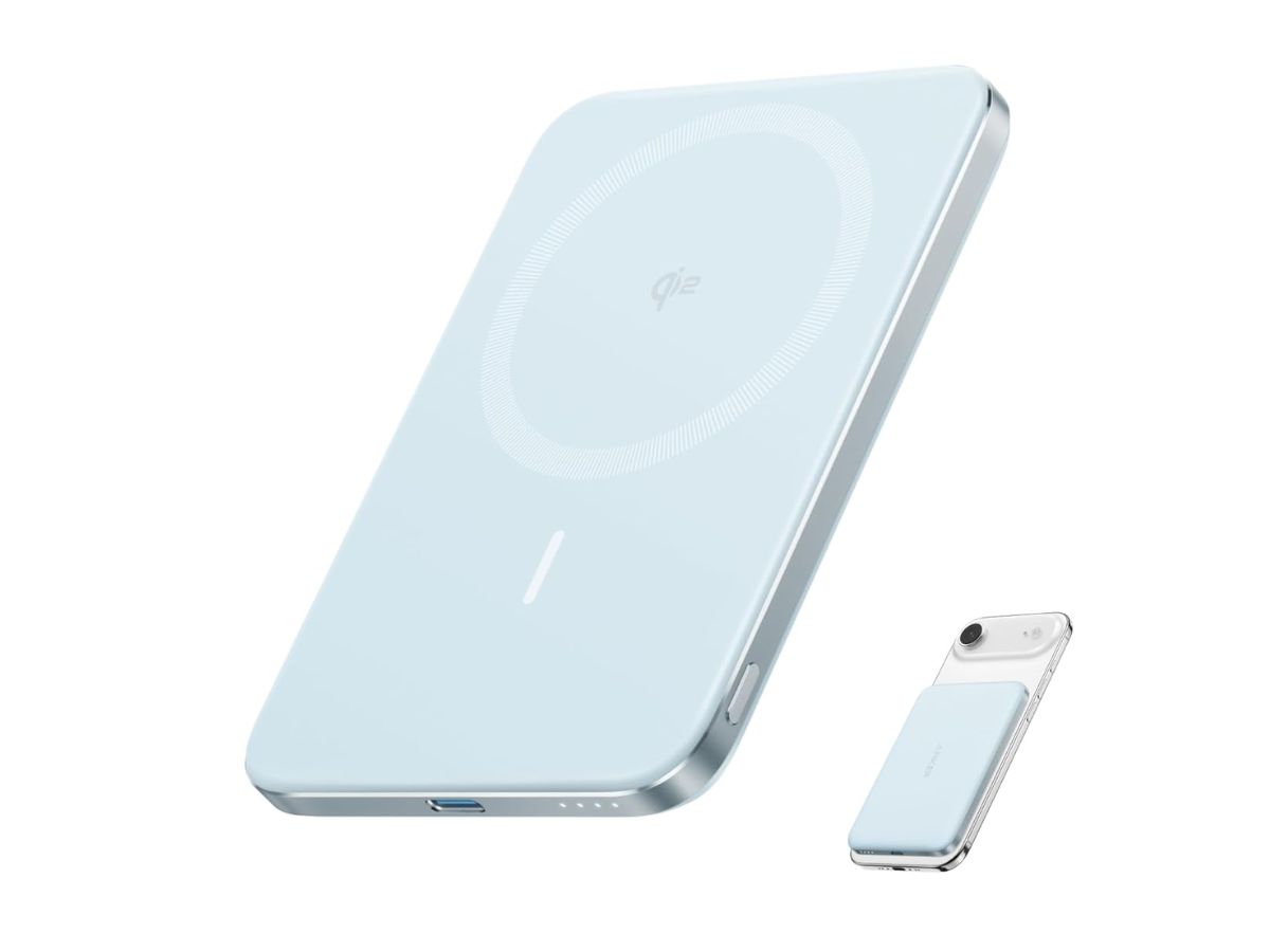 Синяя версия Anker Nano Power Bank (5K, MagGo, Slim) идентична остальным четырем вариантам. Этот портативный зарядный аксессуар имеет два выхода. Первый - это беспроводная зарядная площадка, сертифицированная по стандарту Qi2, которая может выдать до 15 Вт на совместимый смартфон. По словам Anker, это позволит зарядить iPhone 17 до 25% чуть более чем за полчаса. Второй выход - порт USB-C, обеспечивающий мощность до 20 Вт.