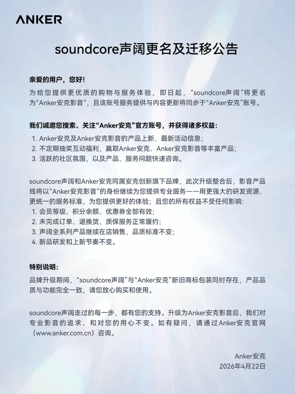 Согласно пресс-релизу, распространенному по каналам социальных сетей, Anker Innovations объявила, что отказывается от бренда Soundcore в пользу Anker Sound & Video. В пресс-релизе также сообщается, что услуги аккаунта и обновления контента для нового бренда теперь будут синхронизированы с официальным аккаунтом Anker.