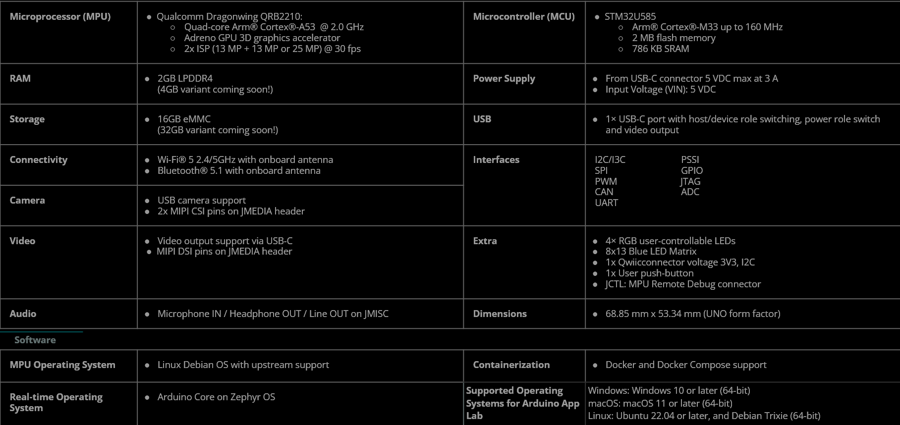 Компания Arduino добавила в семейство UNO новый одноплатный компьютер под названием Arduino UNO Q. Он оснащен множеством функций подключения, таких как Wi-Fi 5, Bluetooth 5.4 и USB-C. В его основе лежит микропроцессор Qualcomm Dragonwing QRB2210 с четырьмя ядрами CPU Arm Cortex-A53 и неуказанным графическим процессором Adreno. Его сопровождает микроконтроллер STMicroelectronics STM32U585 с одним Arm Cortex-M33.