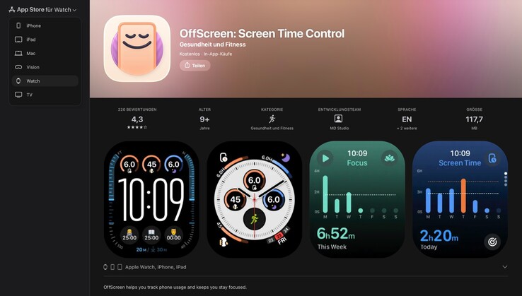 Кнопка в левом верхнем углу экрана позволяет быстро переключаться между всеми платформами Apple, что удобно для просмотра доступного программного обеспечения для Apple Watch, Apple TV 4K или Apple Vision Pro перед покупкой соответствующего продукта