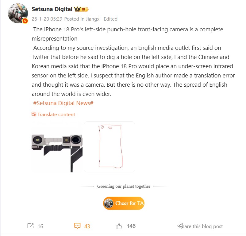 Такое случается нечасто, но в данном случае утечка информации об iPhone 18 Pro была основана, по-видимому, на более или менее простой ошибке перевода. В результате появилось большое количество рендерных изображений и даже видео от известного утечки, которые иллюстрировали, как может выглядеть передняя панель iPhone 18 Pro и iPhone 18 Pro Max. На этих изображениях вместо широкого динамического острова в центре дисплея было изображено перфорационное отверстие в верхней левой части.