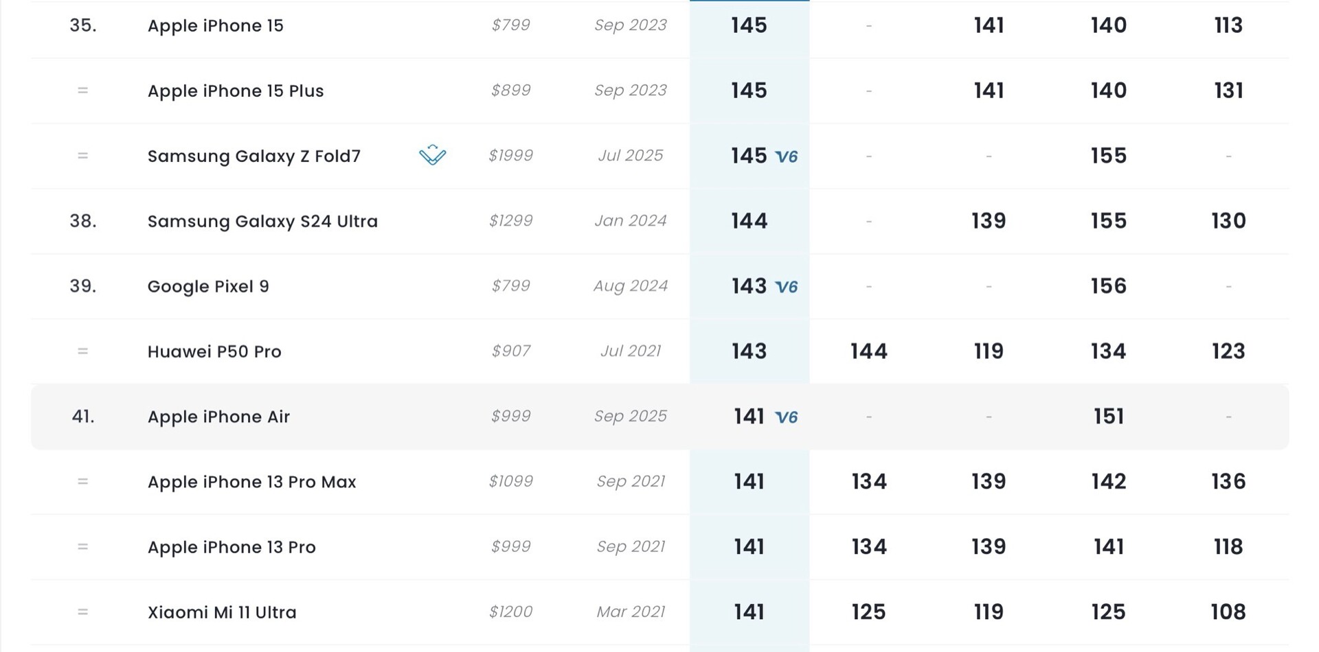 Motorola Edge 70 показывает, что это не обязательно должно быть так: в 5,99-миллиметровый корпус помещаются три задние камеры. На сайте DxOMark подробный анализ камер, отсутствие выделенных камер, как это ни удивительно, приводит к резкому снижению баллов, поскольку цифровой зум и режимы панорамы не могут заменить выделенные сверхширокоугольную и телекамеру. Набрав 141 балл, iPhone Air занимает лишь 41-е место в списке лучших https://www.dxomark.com/smartphones/уступая Google Pixel 8, iPhone 15 и Xiaomi 15