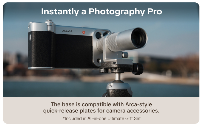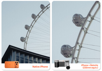 На рукоятке камеры расположены двухступенчатая кнопка спуска затвора для фокусировки и съемки, многофункциональная кнопка, качалка зума и диск управления для регулировки таких параметров, как экспозиция и ISO. В отличие от комплектов камер для флагманских телефонов Vivo и Oppo, Retrova также имеет слот для карт памяти microSD в нижней части, позволяя Вам записывать видео в формате ProRes непосредственно на карту памяти со скоростью до 312 МБ/с. Телеконвертер, который прикручивается к передней части телеобъективов, превращает 4-кратный телеобъектив iPhone 17 Pro в 235-мм эквивалентный 10-кратный оптический зум. При использовании 5-кратного телеобъектива iPhone 16 Pro коэффициент увеличения 2,35x дает 282 мм эквивалента 12-кратного телеобъектива