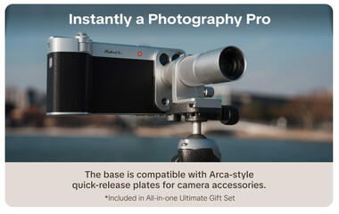 Среди дополнительных опций - телеконвертер 2x, переходное кольцо для фильтров 62 мм/67 мм, пульты дистанционного управления и заполняющие лампы, которые крепятся на магнитах к центральной части корпуса комплекта камеры. Приложение для камеры от производителя имеет ретро графический интерфейс, а также различные фильтры и полноценный профессиональный режим для ручного управления при фото- и видеосъемке. В рукоятку камеры также встроен аккумулятор емкостью 300 мАч, который, судя по всему, используется в основном для функциональности, а не в качестве источника питания для подключенных к док-станции iPhone
