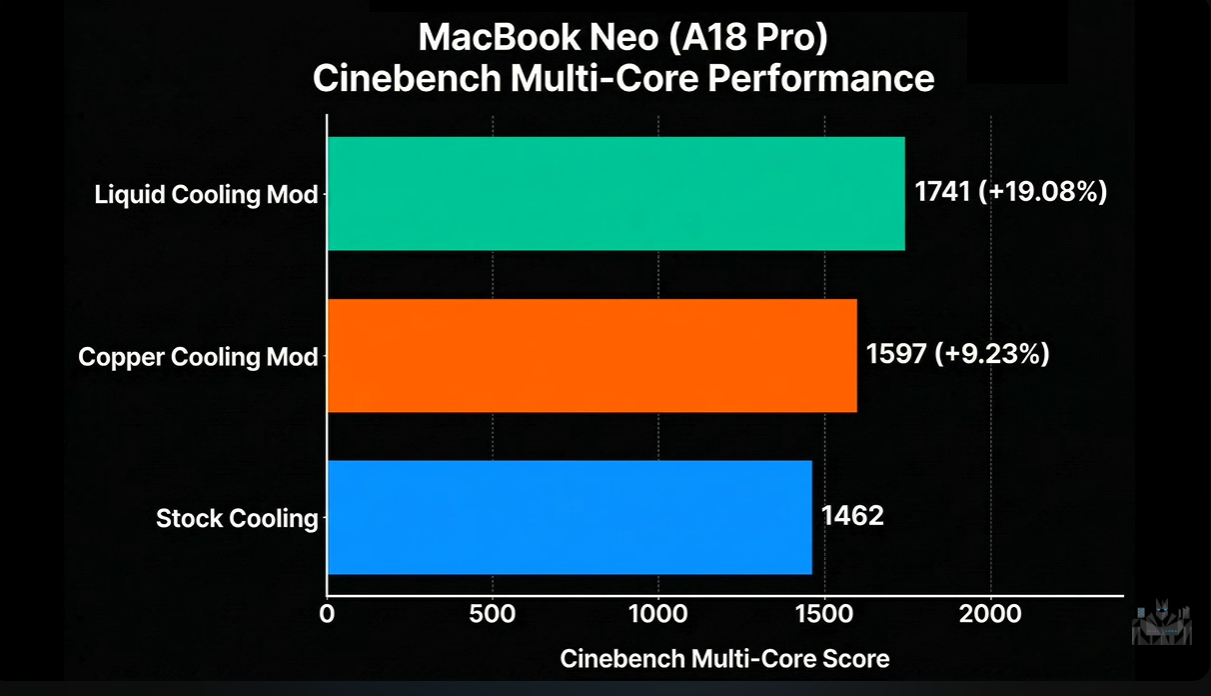 Хотя такое снижение производительности не ощущается при повседневном использовании, MacBook Neo страдает от снижения производительности при длительных высоких нагрузках, например, в играх. Как показывает YouTuber ETA Prime, даже простая медная пластина без каких-либо вентиляторов может увеличить стабильную производительность MacBook Neo.