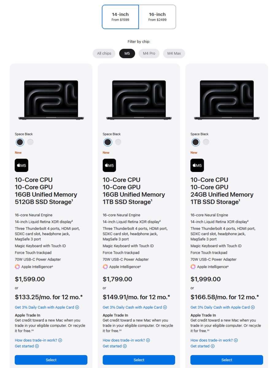 Appleновый 14-дюймовый MacBook Pro, оснащенный чипом Apple M5, уже официально представлен. Новая модель обещает более высокую производительность, улучшенную энергоэффективность и ускоренную обработку искусственного интеллекта при сохранении прежней стартовой цены в $1 599 ($1 499 с экономией на образовании). Предварительные заказы уже сегодня на сайте Apple Storeи начнут продаваться с 22 октября в черном и серебристом вариантах отделки.