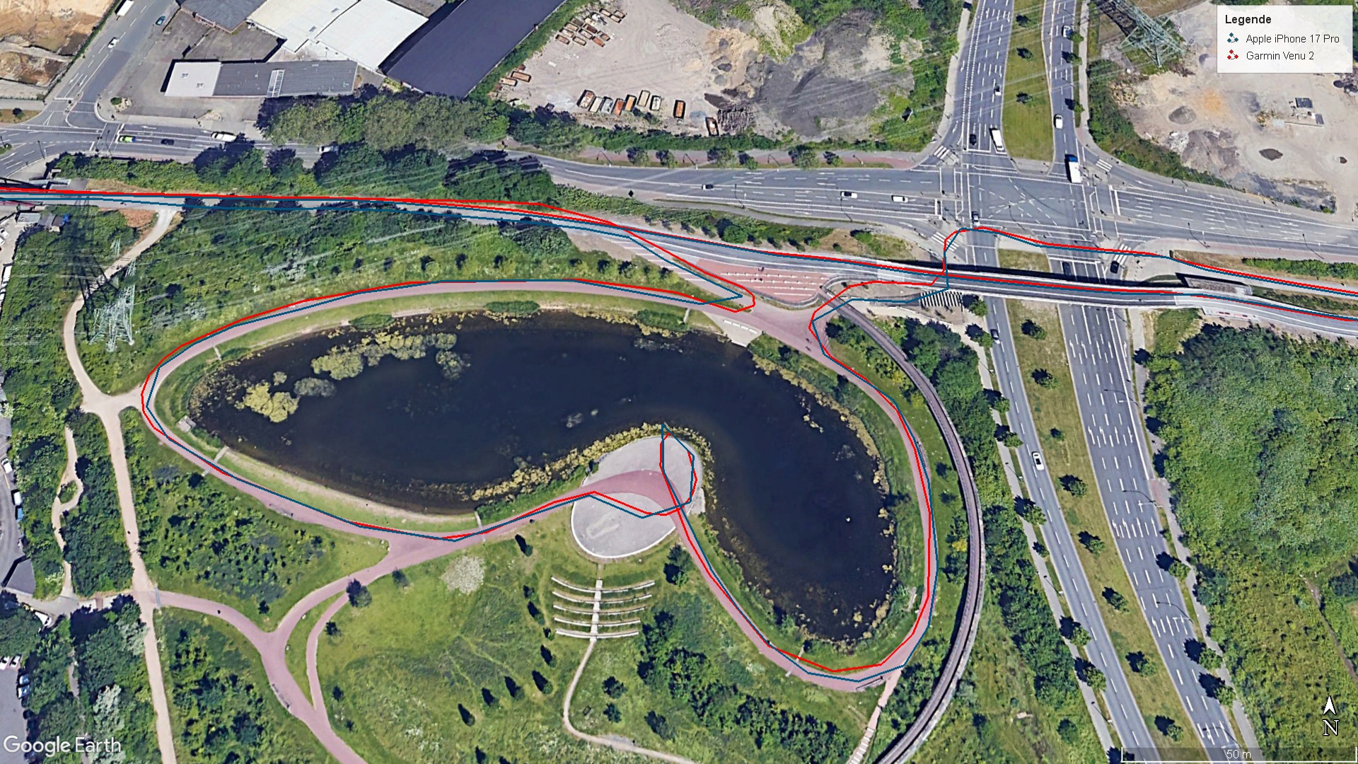 Во время велосипедной прогулки мы сравнили iPhone 17 Pro с Garmin Venu 2, который продемонстрировал очень хорошее отслеживание маршрута и лишь несколько незначительных отклонений.