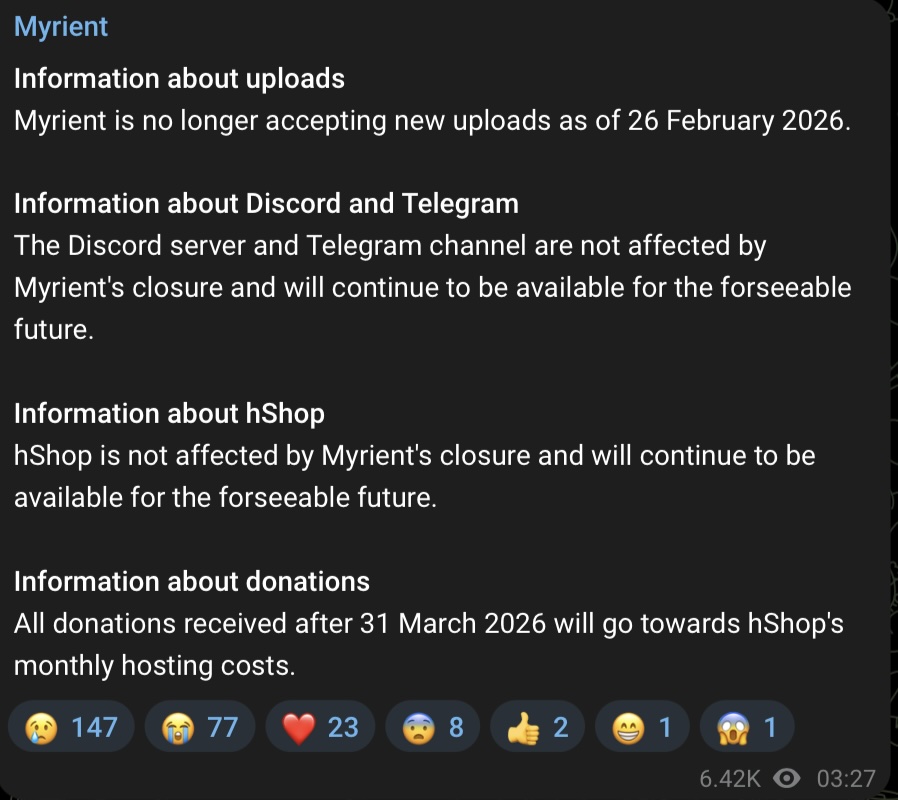 Загрузка файлов на сервис уже прекращена, и его основатель, Алексей, призывает пользователей скачивать любой контент, пока серверы остаются в сети. С момента своего создания Myrient всегда работал как безрекламный сервис, существующий исключительно на пожертвования своих покровителей, и не имел никаких ограничений на скачивание.