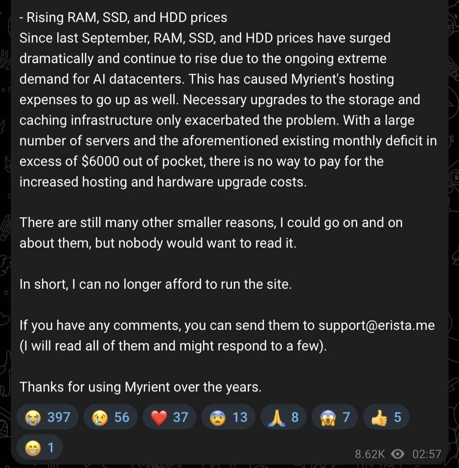 Еще один день, еще одна жертва стремительно растущих цен на оперативную память и накопители. Myrientизвестный проект по сохранению ретро-видеоигр с огромной библиотекой в 390 ТБ, прекратит свою работу в конце следующего месяца.