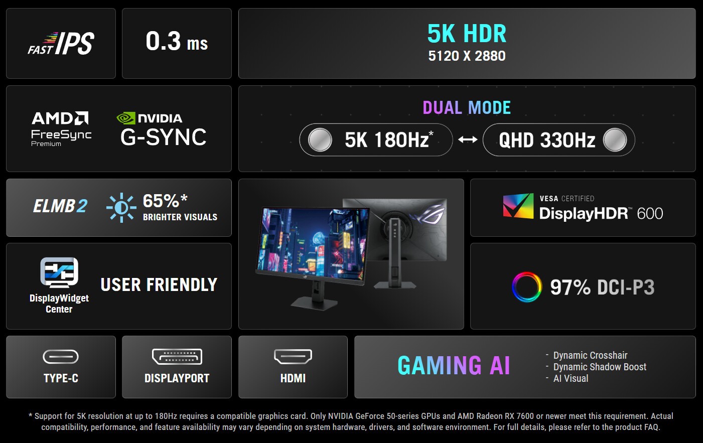 Даже при родном разрешении 5K монитор XG27JCG способен обеспечить плавную частоту обновления 180 Гц. Само собой разумеется, что для достижения этого потолка пользователям потребуется достаточно мощный графический процессор. Asus рекомендует карты серии Nvidia GeForce RTX 50 или AMD Radeon RX 7600 и новее. Другие игровые функции включают поддержку G-Sync и FreeSync Premium, время отклика 0,3 мс GtG и Extreme Low Motion Blur 2 (ELMB 2) для улучшения четкости в быстро развивающихся играх.