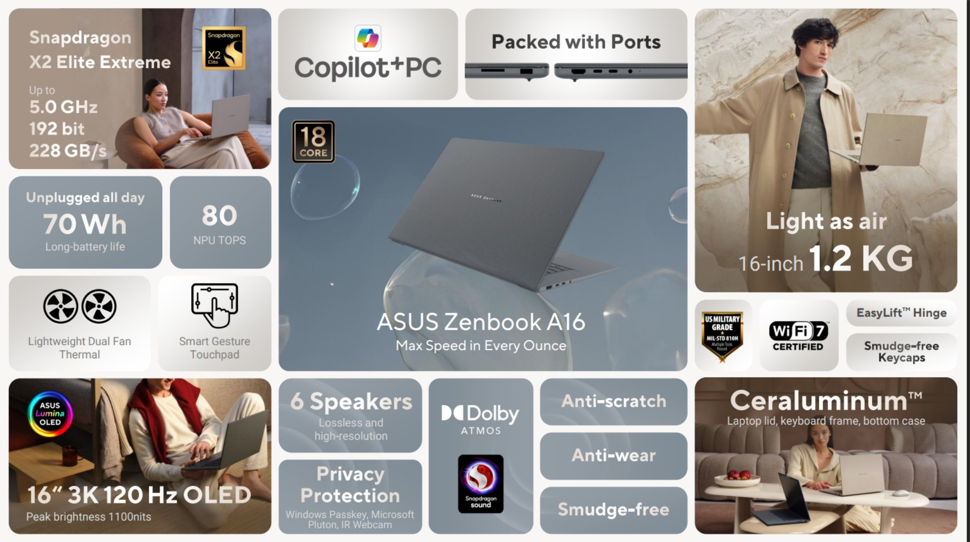 Более того, Zenbook A16 оснащен процессором Snapdragon X2 Elite Extreme чипсетом с 18 ядрами Oryon и энергопотреблением 65 Вт, а также 48 ГБ оперативной памяти и твердотельным накопителем емкостью 1 ТБ. Все это оборудование упаковано в корпус весом 1,2 кг и толщиной 13,8~16,5 мм, в котором также имеются разъемы HDMI 2.1, USB4, USB Type-A и вход/выход для карт памяти SD 4.0. В настоящее время Asus надеется начать продажи Zenbook A16 в этом квартале. Однако конкретная дата начала продаж и цена пока остаются неизвестными.