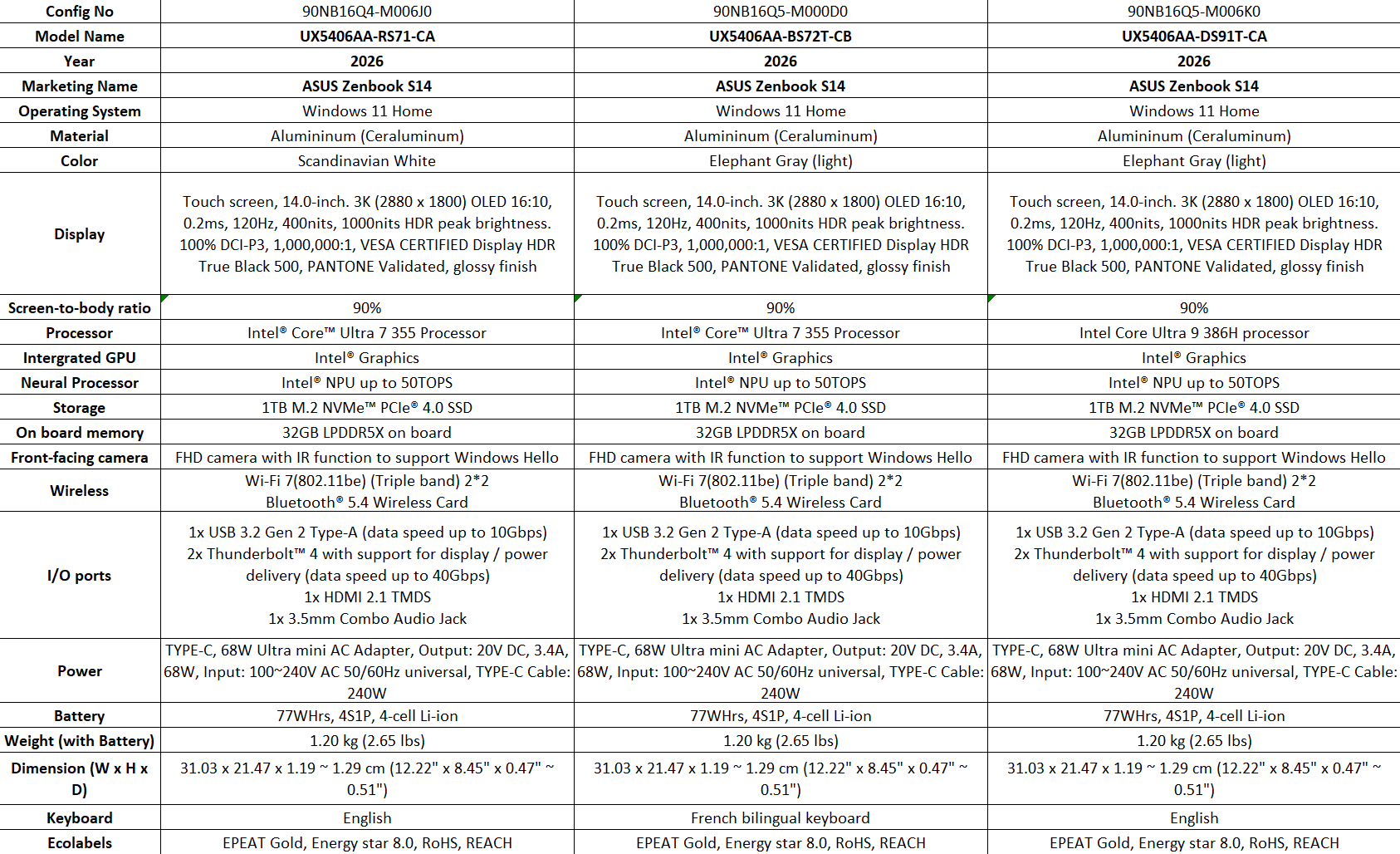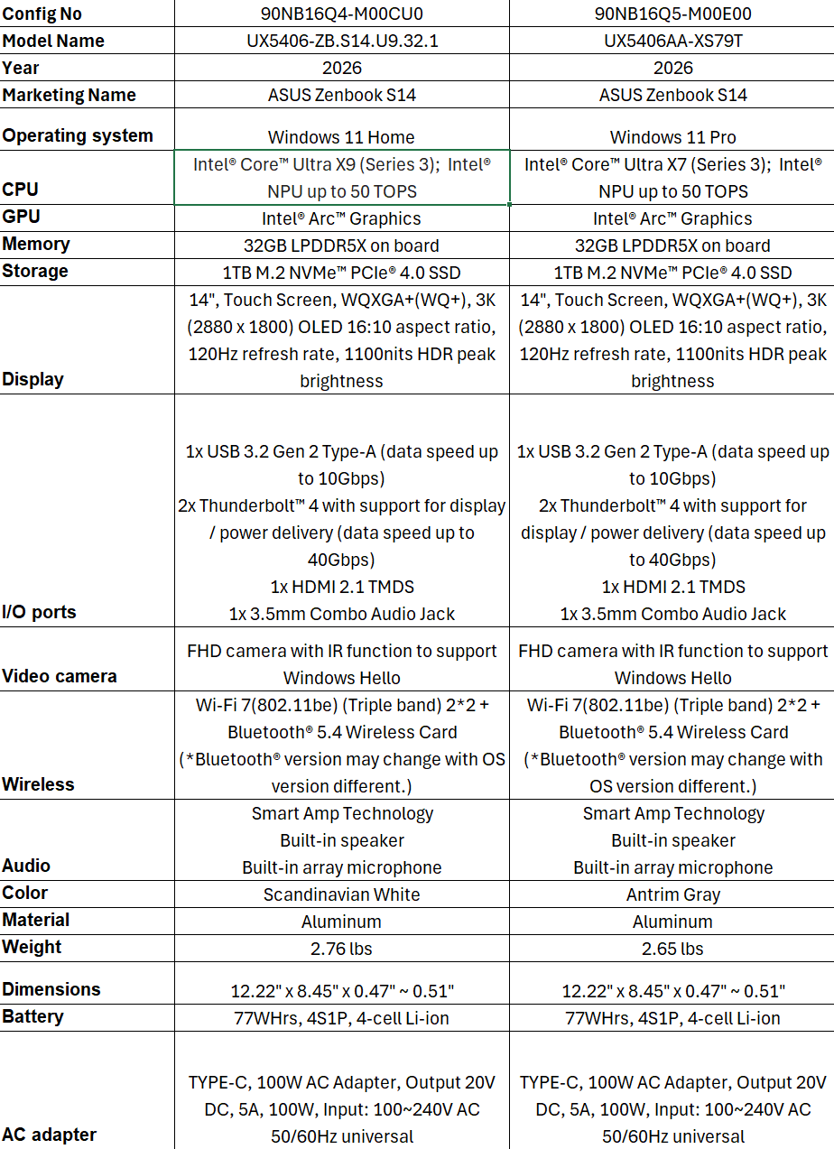 Согласно пресс-материалам Asus, американская версия Zenbook S14 предлагает Core Ultra X7 и Core Ultra X9 в то время как канадские SKU ограничены вариантами Core Ultra 9 386H и Core Ultra 7 355. Ожидается, что устройства, продаваемые в Европе, также получат процессоры Core Ultra X Series 3, которые оснащены интегрированными Arc B390 графикой.