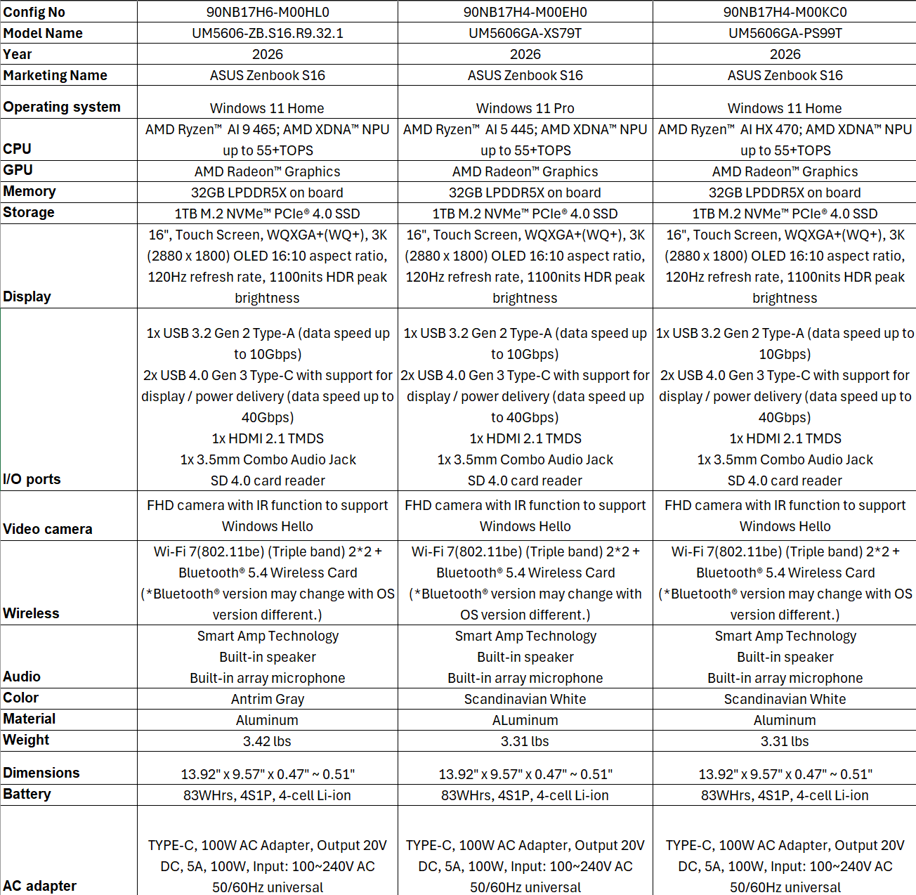 Zenbook S16 (UM5606), с другой стороны, оснащен новым AMD Ryzen AI 400 Gorgon Point APU. Конфигурации, предлагаемые для рынка США, включают конфигурации на базе Ryzen AI 9 HX 470, Ryzen AI 9 465и странный Ryzen AI 5 445 (скорее всего, опечатка), которого пока нет в реестре AMD.