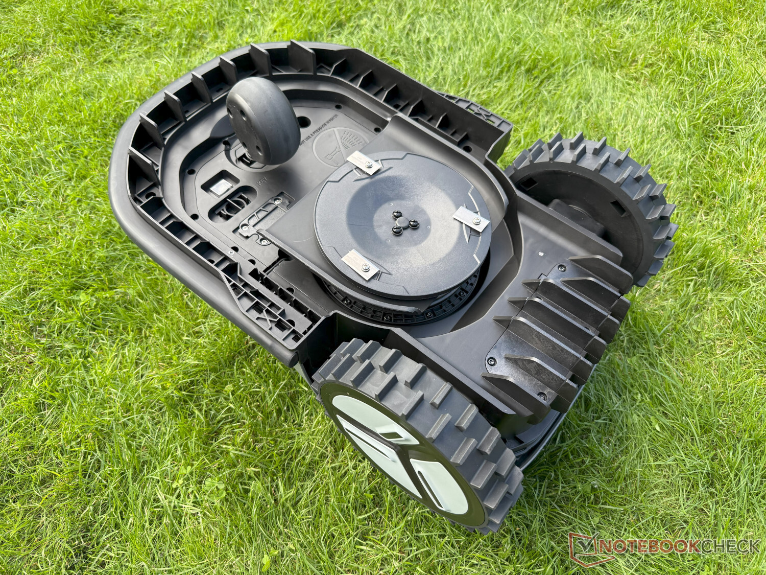 Снизу расположен классический косильный диск с тремя ножами и шириной стрижки 203 мм. С этим можно справиться, но V1000 также предназначена только для газонов площадью до 1 000 квадратных метров. Высота стрижки снова регулируется электрически через приложение, на выбор от 25 до 75 мм с шагом 5 мм.