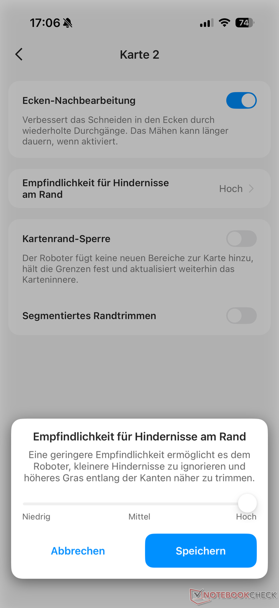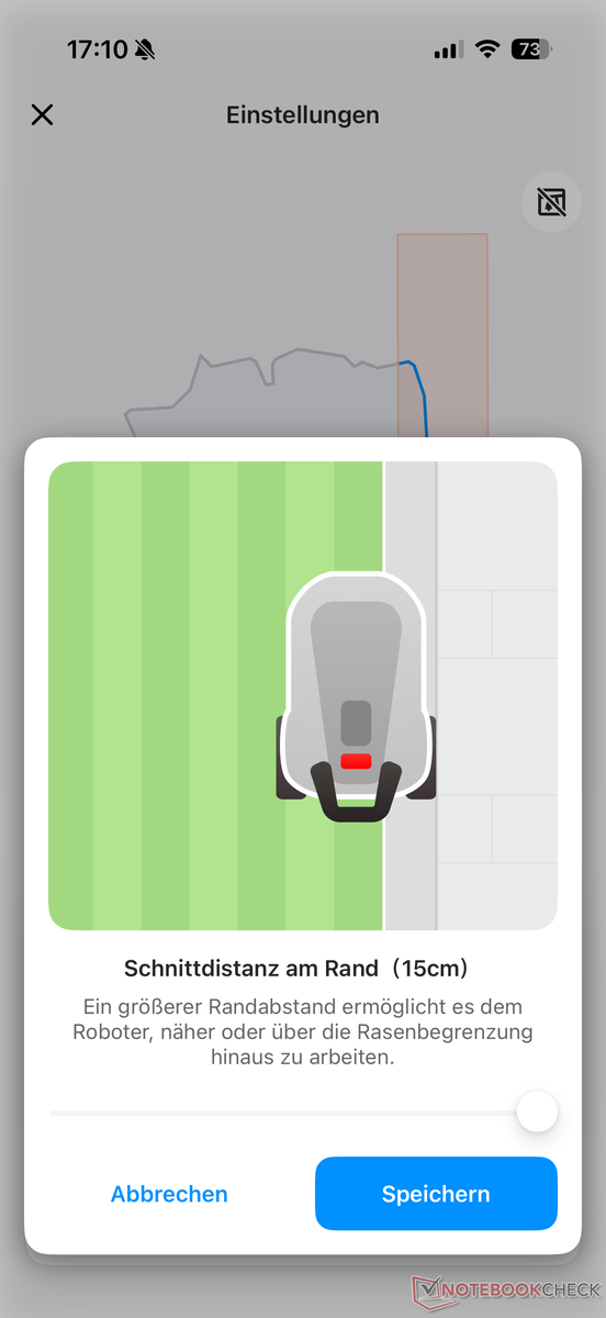 Кроме того, есть функция блокировки краев карты, при которой робот строго придерживается карты. Это предотвращает проблему, с которой мы столкнулись с Eufy E15/E18 во время тестирования. Если на газоне, который, например, плавно переходит в газон соседа или в другие участки, не подлежащие стрижке, не создана зона отчуждения, робот-газонокосилка автоматически расширяет зону стрижки на виртуальной карте до крайнего края благодаря автоматическому обнаружению травы.