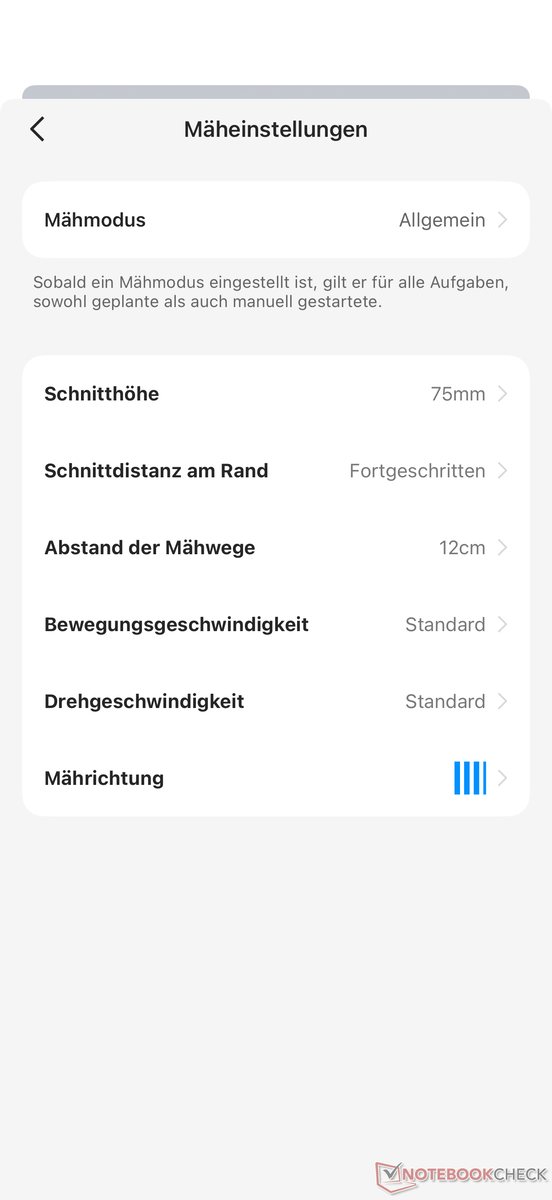 Различные опции доступны и для общих настроек кошения. Помимо режима кошения (общий или индивидуальный для каждой зоны), можно индивидуально настроить высоту скашивания, расстояние между дорожками (от 8 до 14 см), скорость движения (тонкая, стандартная, быстрая) и направление кошения (угол выбирается произвольно).
