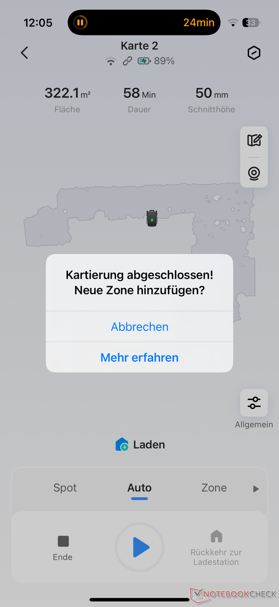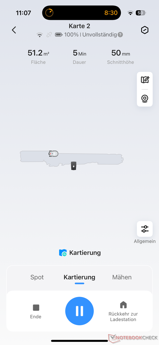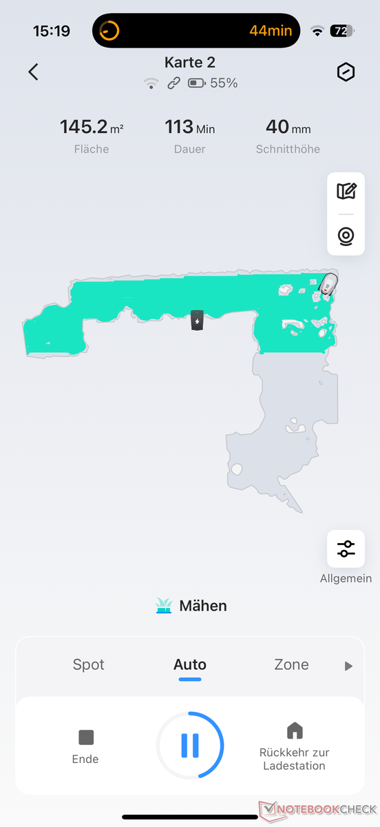 Это сработало без проблем на двух разных тестовых участках. Роботизированная газонокосилка надежно и точно нанесла участок на карту, хотя это может занять некоторое время в зависимости от его размера. Газон площадью 250 квадратных метров он покрыл чуть более чем за час. Однако для составления карты необходимо разместить зарядную станцию на газоне или рядом с ним. Позже ее можно проложить через приложение, включая путь к газону, что объясняется в видеоролике и надежно сработало во время теста