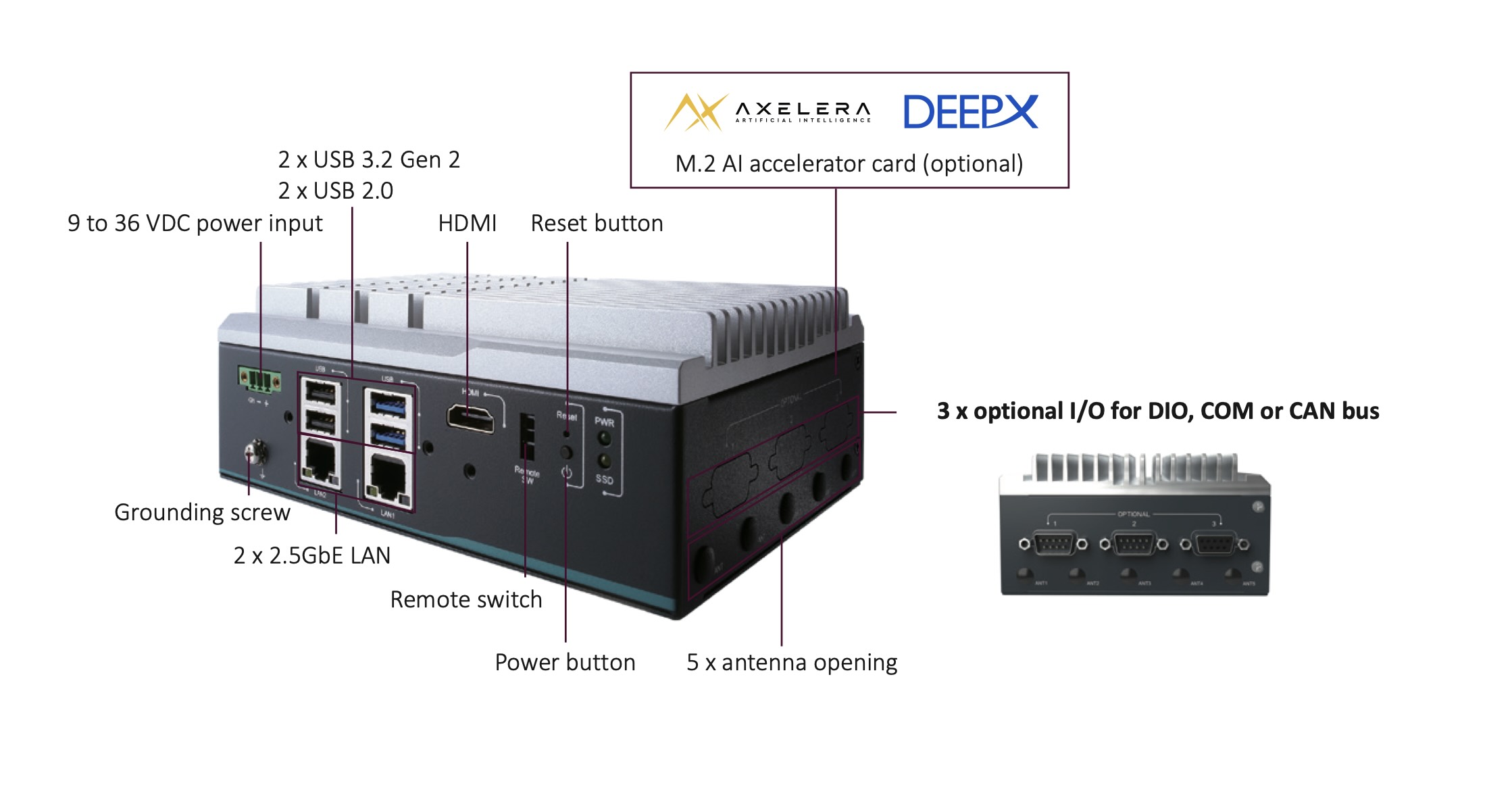 Промышленный мини-ПК оснащается 8 или 16 Гб оперативной памяти LPDDR5 SDRAM, а за хранение данных отвечают 2,5-дюймовый M.2 2280, а также слот mSATA. Также присутствует слот M.2 2230 для размещения беспроводных сетевых карт. На сайте пассивное охлаждение система выполнена из алюминия и стали, что придает мини-ПК очень индустриальный вид, подходящий для его предполагаемого окружения. Кроме того, предусмотрен слот nano SIM. Предлагаемые устройства ввода/вывода выглядят следующим образом: