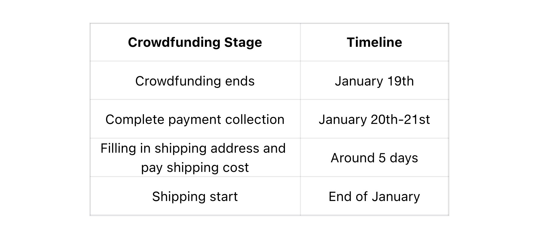 По-видимому, согласно правилам Indiegogo, сбор платежей должен произойти в течение 15 дней после окончания кампании. После этого бэкерам потребуется еще от 5 до 15 дней, чтобы предоставить свои данные для доставки и оплатить ее. Исходя из вышеизложенного, доставка должна начаться в конце февраля.