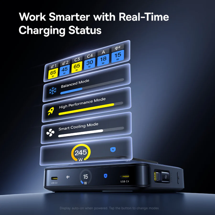 Nomos NH21 имеет встроенный 3-дюймовый ЖК-дисплей, на котором отображается такая важная информация, как общая мощность в реальном времени, режимы, анимация загрузки, выход беспроводной зарядки и многое другое. Если говорить о совместимости, то зарядное устройство совместимо с широким спектром устройств, включая смартфоны, планшеты, ноутбуки, дроны и фотоаппараты. Более того, оно поддерживает протоколы быстрой зарядки PD 3.1, QC 4, PPS и SCP.