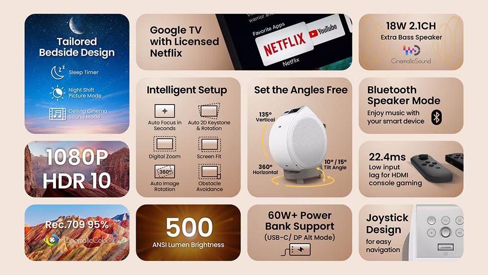 Проектор GV32 не обладает особо короткой проекцией, а именно 1:1,2, поэтому для проекции диагонали 60 дюймов требуется расстояние 1,5 метра, а для 120 дюймов - 3,2 метра. Внешний плеер не нужен, так как в комплект входит Google TV, с помощью которого можно воспроизводить материалы с Netflix или YouTube. Поддерживается WiFi, и можно использовать 60-ваттный блок питания. Изображения также можно передавать через USB-C. GV32 рекламируется с задержкой ввода 22,4 миллисекунды, что должно сделать его пригодным для использования с игровыми консолями. Интеллектуальные функции призваны упростить настройку и снизить трудозатраты. В США модель поступит в продажу по цене $599 на сайте https://www.benq.com/en-us/projector/portable/gv32/buy.html. Информация о доступности на других рынках еще не получена