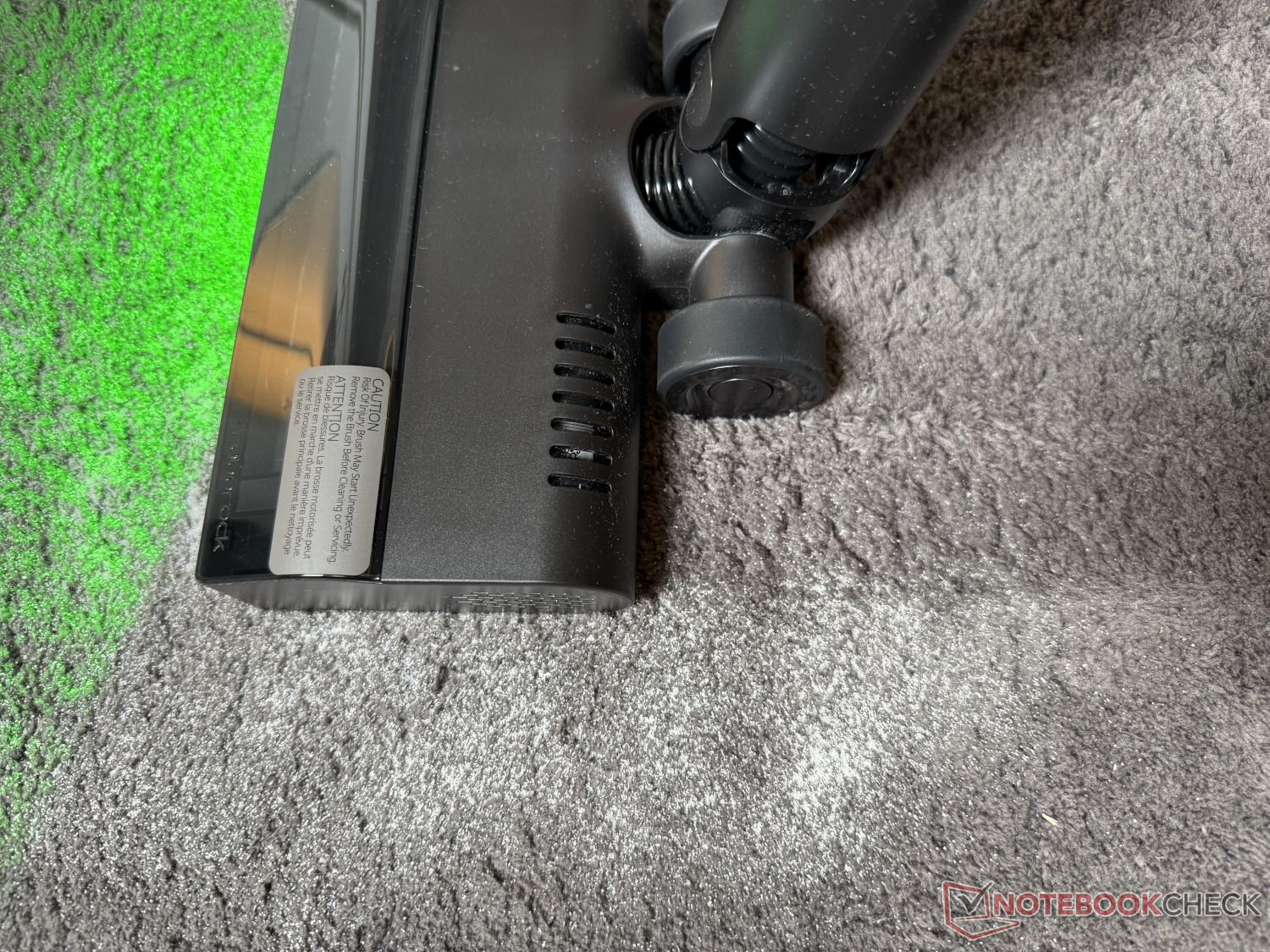 H60 Hub Ultra от Roborock также хорошо показал себя на коврах, участвовавших в тесте, и смог удалить много грязи, но не всю, даже с более длинным ворсом. Однако после нескольких проходов по сильно загрязненным участкам (например, с мелким песком) большая часть грязи была собрана. Волосы почти не запутываются в валике, поэтому ручное вмешательство обычно не требуется. Зеленый свет на щетке для пола - это практичная функция. Так грязь становится более заметной.