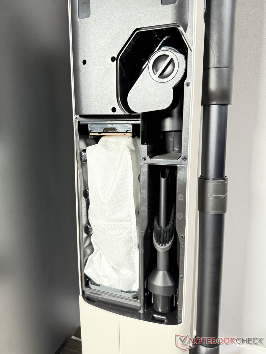 Чтобы получить доступ к сумке, необходимо снять магнитную панель на левой стороне станции. К сожалению, она не открывается, как дверца, но Вы держите ее в руке. Помимо мешка для сбора пыли, здесь также есть место для двух прилагаемых аксессуаров: моторизованной мини-щетки и щелевой щетки 2-в-1. Это означает, что аксессуары всегда на месте.