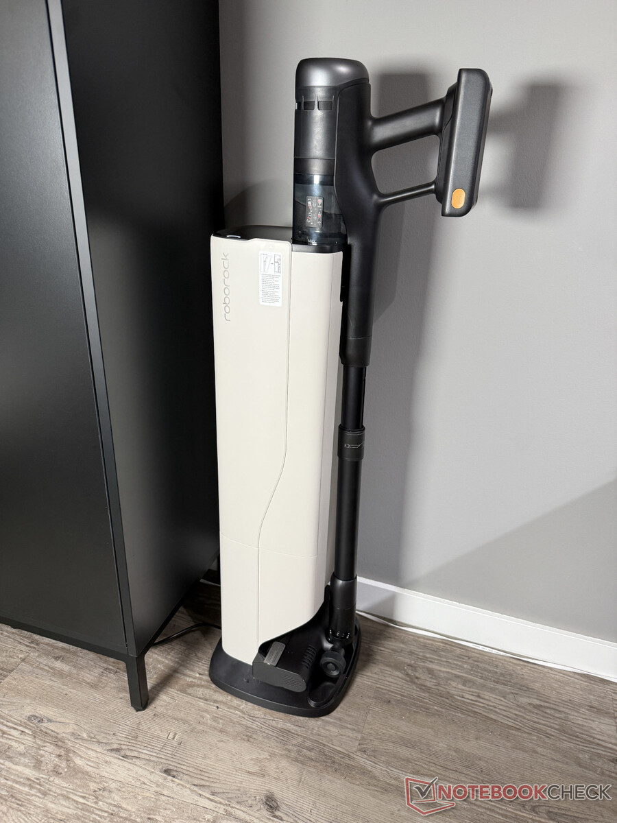 Вес аккумуляторного пылесоса с телескопической трубкой и щеткой для пола составляет около 3 кг, включая сменную батарею (блок двигателя с батареей около 1,8 кг). На рынке есть более легкие, но и более тяжелые приборы. Как и у большинства конкурентов, центр тяжести Roborock H60 Hub Ultra находится в верхней части, где расположены мотор и аккумулятор. Это заметно при длительном использовании.