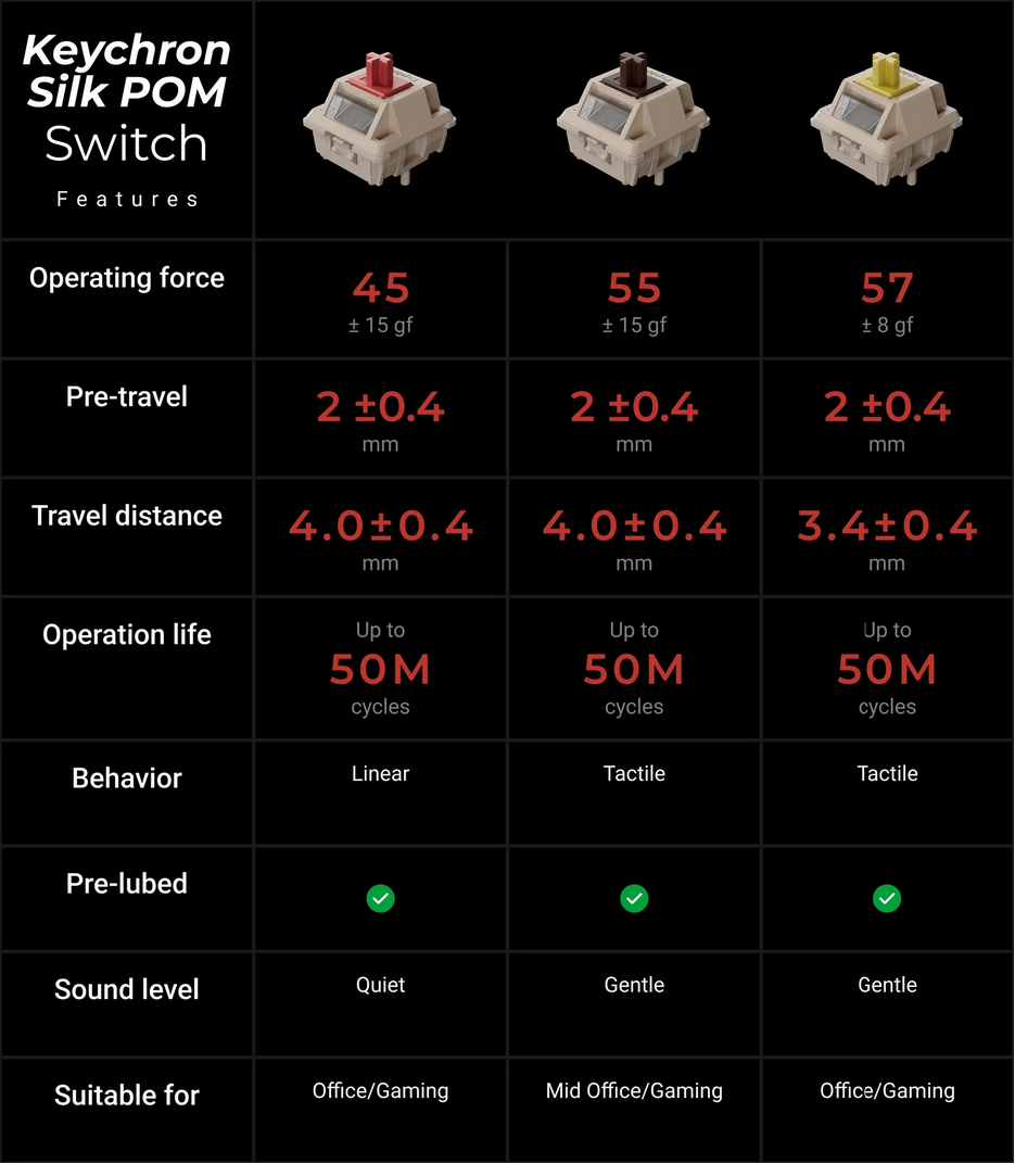 | Варианты переключателей по умолчанию | Keychron Silk POM Красный (линейный), Коричневый (тактильный), Банановый (остро-тактильный) | ||