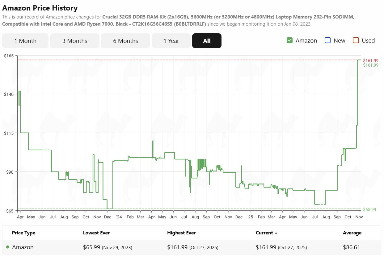 Например, самый продаваемый комплект памяти на Amazon, 32 ГБ DDR5-5600 от Crucial, в настоящее время продается по цене $161,99, что в 2,75 раза больше, чем $65,99 по сравнению с минимальной ценой, установленной в ноябре 2023 года (через camelcamelcamel).