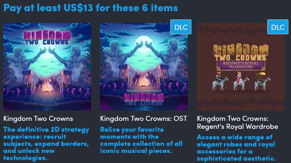 Последний пакет Humble Bundle - Kingdom 10th Anniversary Bundle - содержит 8 предметов: 3 игры и 5 DLC. Пакет содержит предметы на сумму $82, но продается за $15. Срок его действия истекает 15 ноября 2025 года.