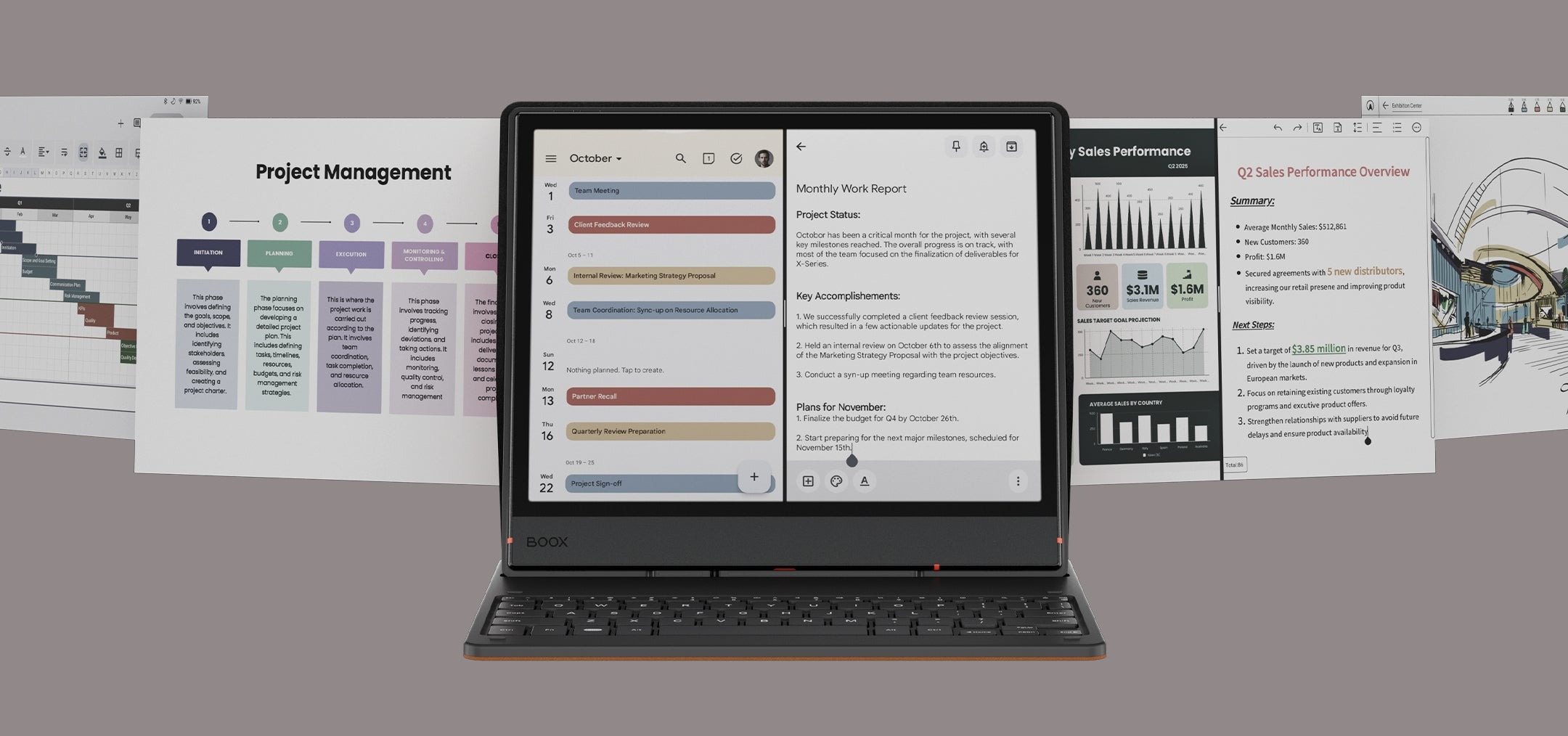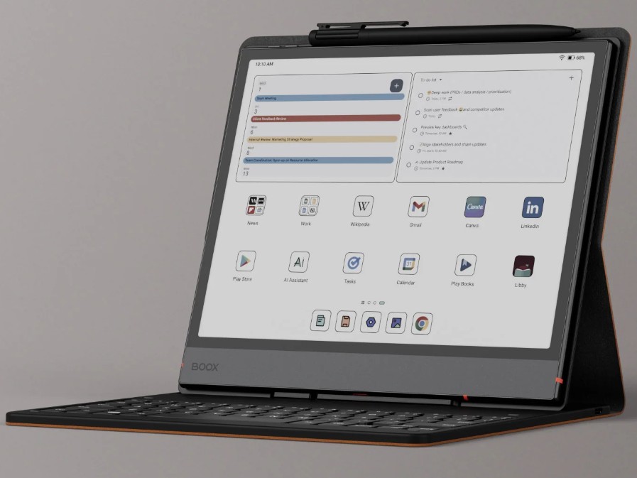 Boox поставляет его вместе со стилусом с пятью дополнительными наконечниками и защитным магнитным чехлом, который можно использовать в портретной или альбомной ориентации. Если Вы выберете комплект с чехлом-клавиатурой, то получите скидку ~$33/€33 и заплатите $606,99/€606,99 вместо $639,98/€639,98.