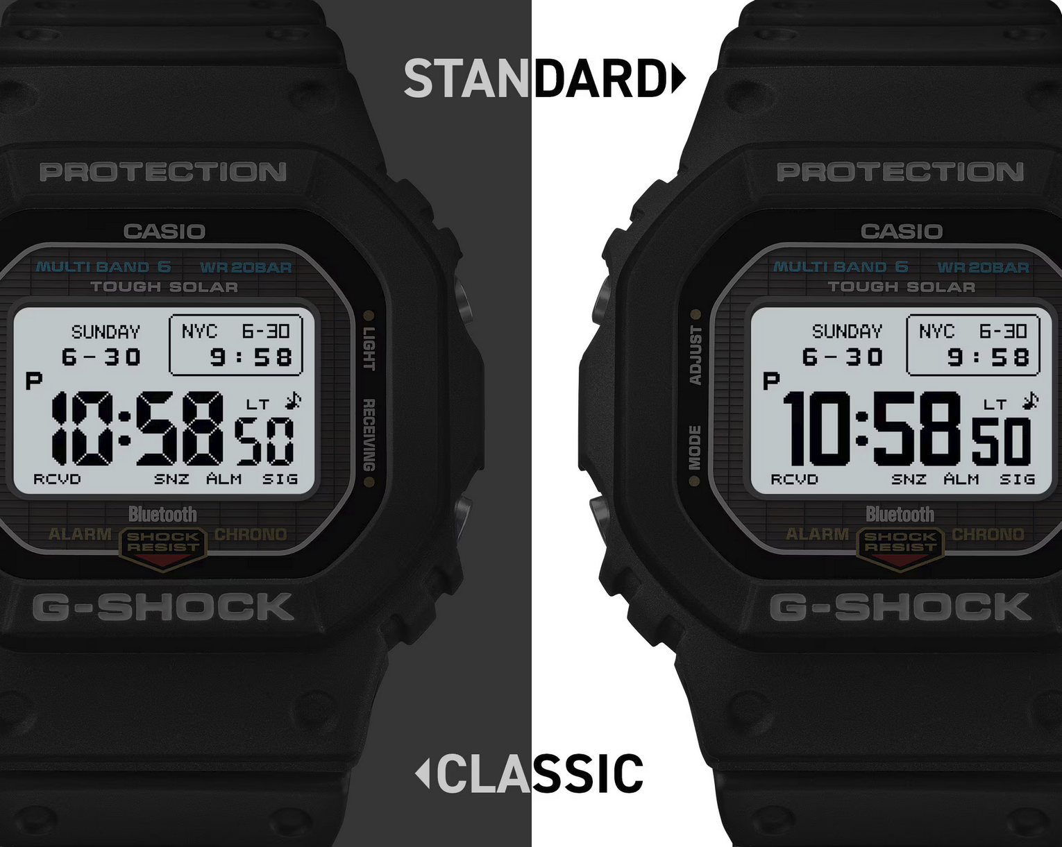 На изображениях товара показаны два режима отображения - стандартный и классический - с использованием новой ЖК-панели MIP. Сравнение делает обновление читаемости еще более очевидным, особенно с учетом того, как контрастно выглядят цифры при разном освещении. На страницах товаров также представлены оригинальные модели серии 5600. Обе модели часов близки к классической форме DW-5600, но внутреннее оснащение смещено в сторону комбинации Tough Solar, синхронизации смартфона по Bluetooth и радиоприема Multiband 6. В явном примечании на странице говорится, что солнечная панель имеет рисунок, напоминающий кирпич, как в ранних моделях G-Shock.